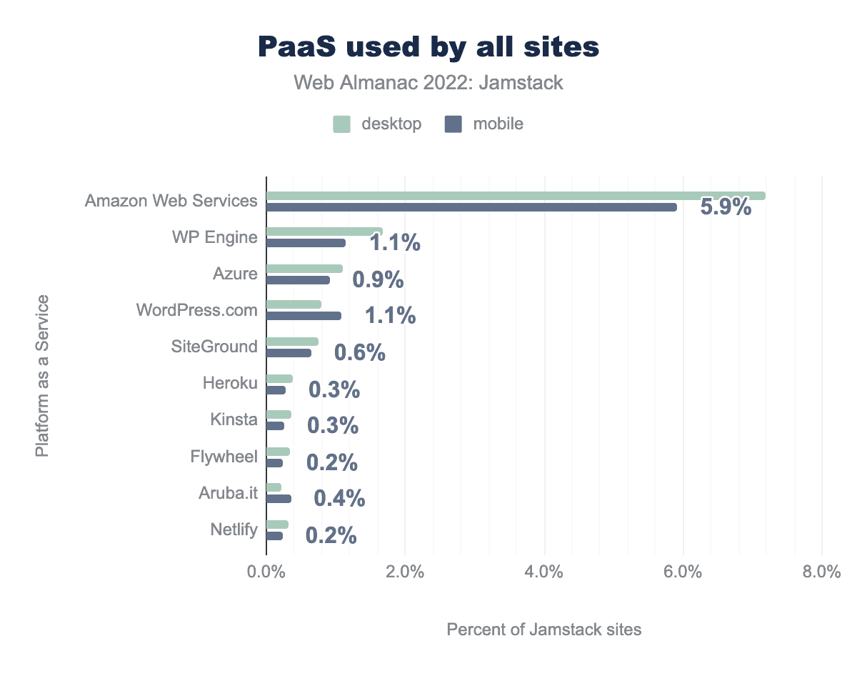 We were also interested in where people host their Jamstack-y sites. Would there be a pattern? Once again, we used Wappalyzer’s data to identify technologies, this time using their Platform as a Service (PaaS) category.