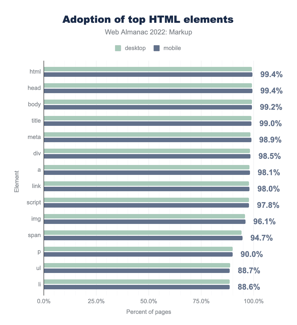 html is used on 99.3% of desktop and 99.4% of mobile page, head on 99.3% and 99.4% respectively, body on 99.1% and 99.2%, title on 98.9% and 99.0%, meta on 98.5% and 98.9%, div on 98.3% and 98.5%, a on 98.0% and 98.1%, link on 97.8% and 98.0%, script on 97.6% and 97.8%, img on 95.9% and 96.1%, span on 94.2% and 94.7%, p on 89.9% and 90.0%, ul on 88.8% and 88.7%, and finally li on 88.7% of desktop and 88.6% of mobile pages.It’s not a surprise that nearly every document uses html, head, or body tags—they are automatically inserted in the DOM and that is what is being counted here. That the numbers are slightly less than 100% is due to a small number of pages that break detection by overriding the JavaScript APIs we use—for example, MooTools overriding the JSON.stringify() API.