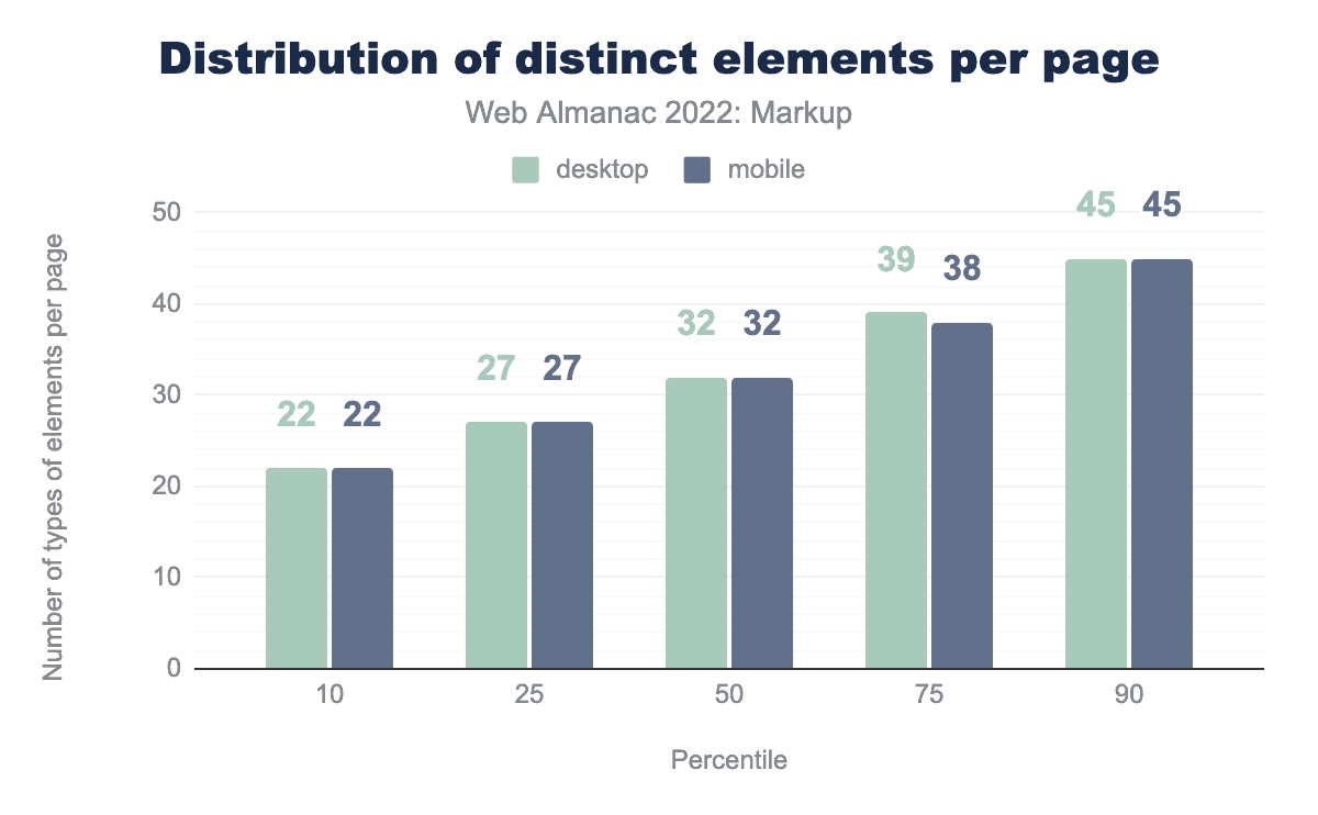 The median is up from 31 elements in 2021, and 30 elements in 2020. As this is a trend throughout, it may be a tender sign that developers put HTML elements to better use, by using more of them for what they’re there for.