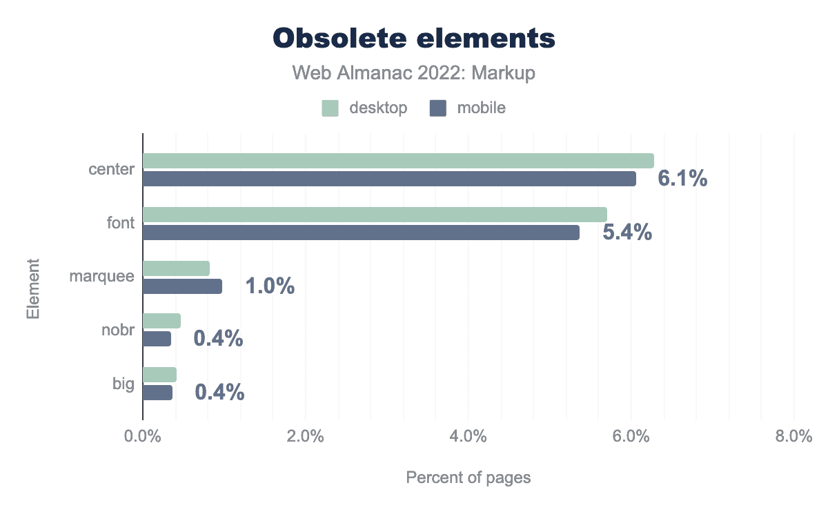 center is used on 6.3% of desktop and 6.1% of mobile pages, font is used on 5.7% and 5.4% pages respectively, marquee on 0.8% and 1.0%, nobr on 0.5% and 0.4%, and finally big 0.4% of desktop and mobile pages.On 6.1% of pages, you still find center elements (hi Google home page), and on 5.4% of pages, you find font elements. Use of both elements went down (down 0.5% in both cases), fortunately, while marquee, nobr, and big didn’t witness significant changes.