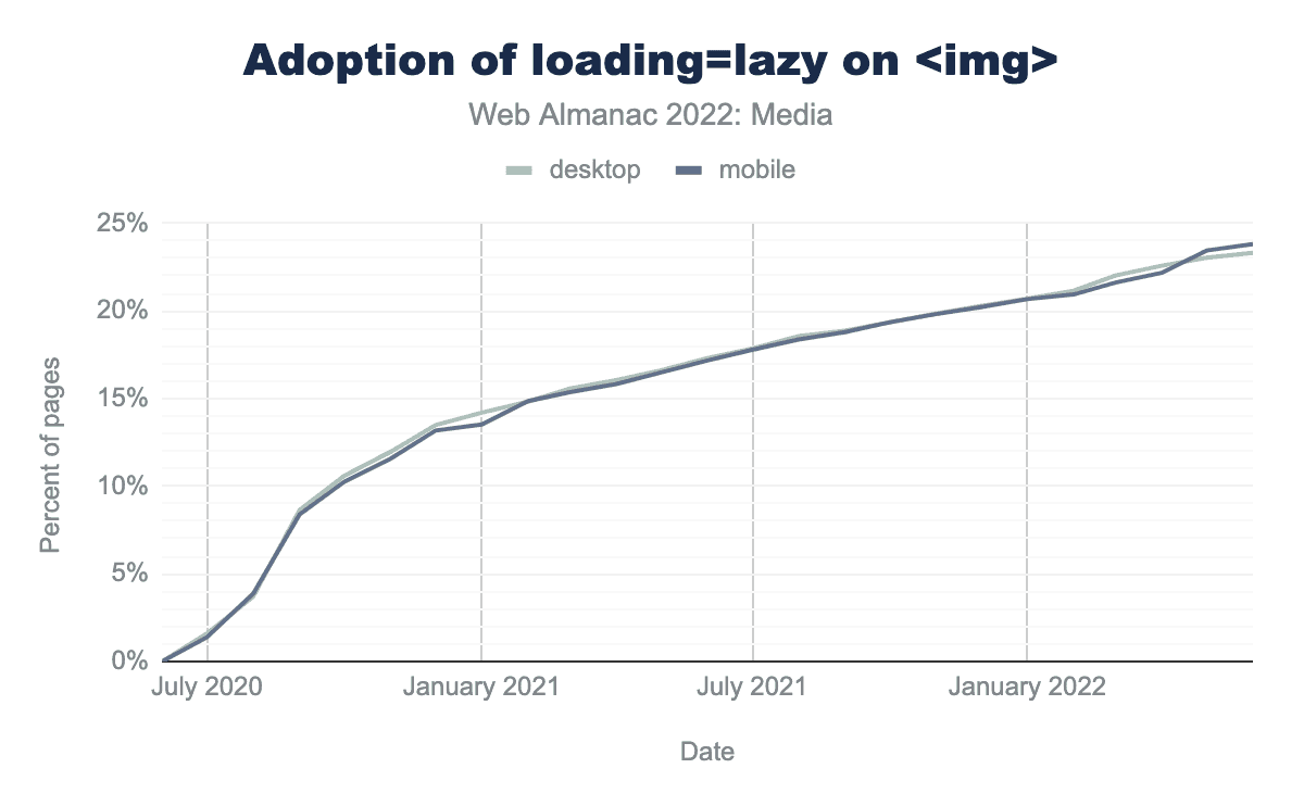 Given the vast amount of legacy content on the web, going from zero adoption to just about one-quarter of crawled pages within two years is a remarkable feat, and shows just how much demand there was for native lazy-loading.