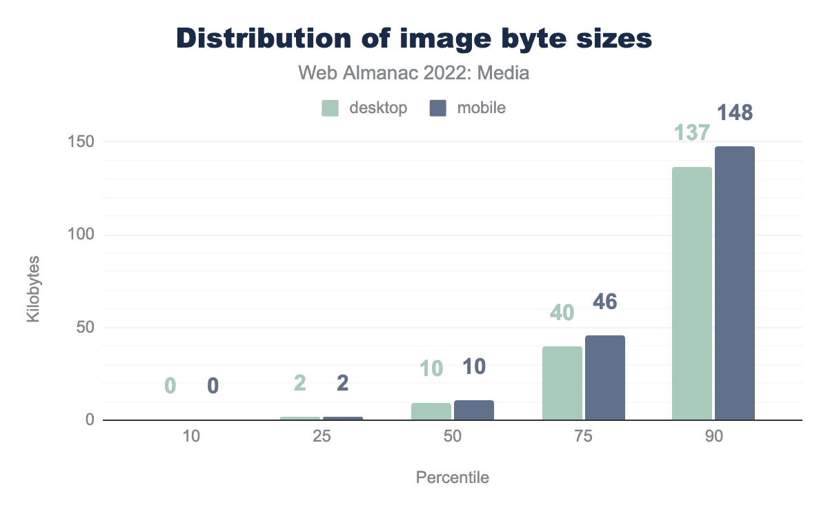 Most pages have at least one image over 100 KB, and the top 10% of pages have at least one image that weighs almost 1 MB or more.