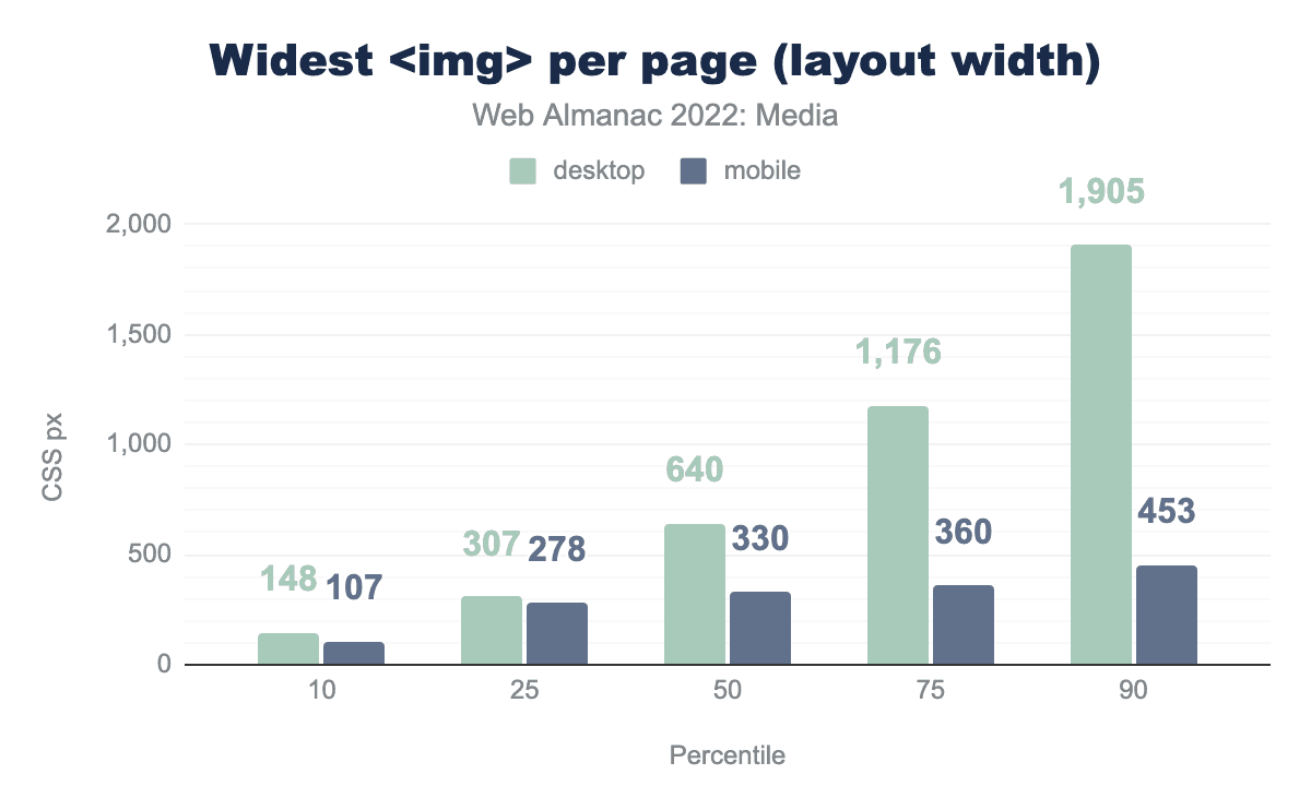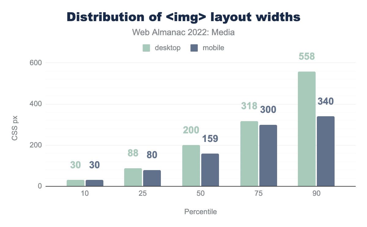 <img> layout widths, on both desktop and mobile. At the tenth percentile, both the desktop and mobile layout width was 30 CSS px. The 25th percentile widths were 88 px for desktop and 80 px for mobile. The 50th percentile numbers were 200 px and 159 px; the 75th percentile saw 318 and 300 px, and the 90th percentile saw a comparatively large 558 px on desktop and 340 px on mobile.<img> layout widths.