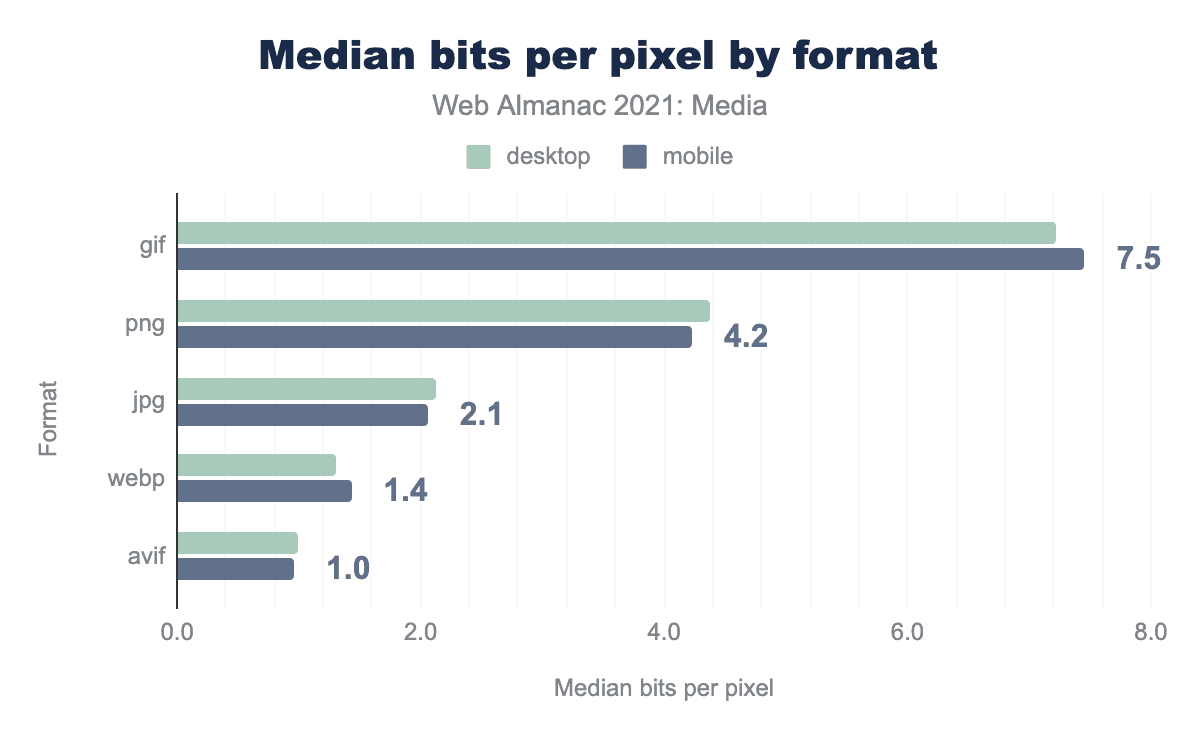 At 2.3 bits per pixel, the median <img> on mobile almost hits that 10:1 compression ratio target on the nose. However, around that median, there is a tremendous spread. Let’s break things down by format in order to learn a bit more.