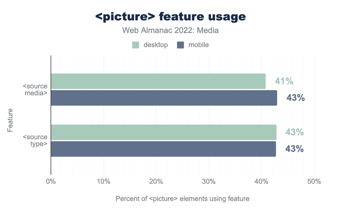 media and type attributes on source elements, in conjunction with the picture element. media is used with 41% of picture elements on mobile, and 43% on desktop. type is used with 43% of picture elements on both mobile and desktop.<picture> feature usage.
