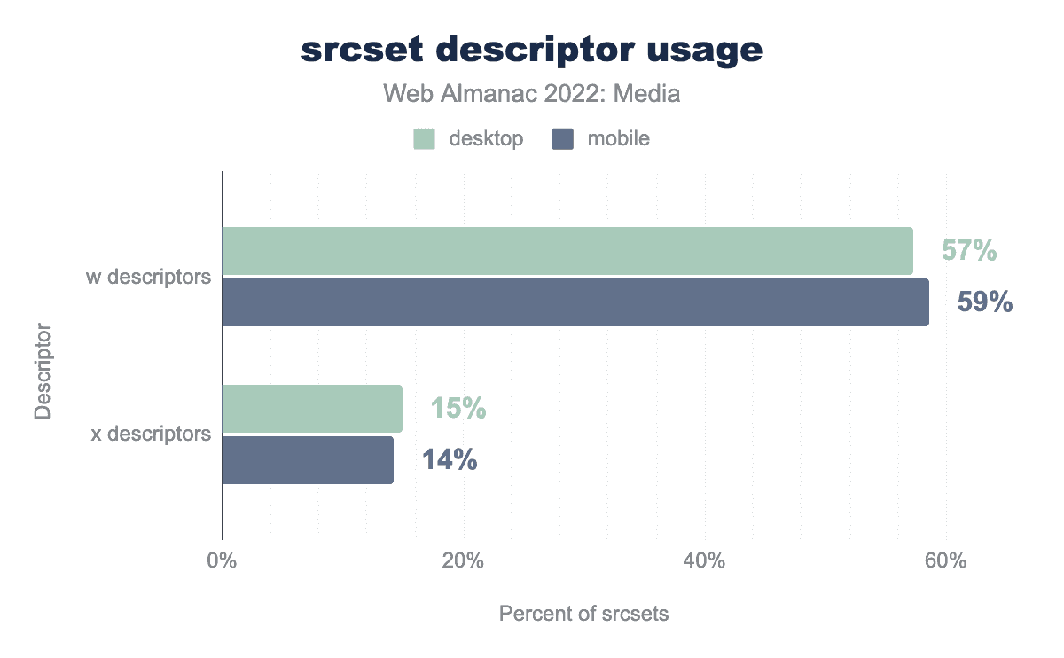 srcsets using x descriptors and w descriptors, on both mobile and desktop. x descriptors are used on 15% of srcsets on desktop and 14% of srcsets on mobile. w descriptors are used four times more: 57% of the time on desktop, and 59% of the time on mobile.srcset descriptor usage.
