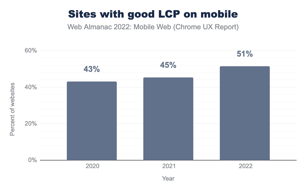 LCP performance is improving. In 2020, 43% of mobile sites had a LCP assessed as “good”. In 2021, this number improved to 45% of mobile sites. There was a significant jump in 2022 in which 51% of mobile sites had good LCP performance. The Performance chapter explores some possible explanations for why this may have happened.