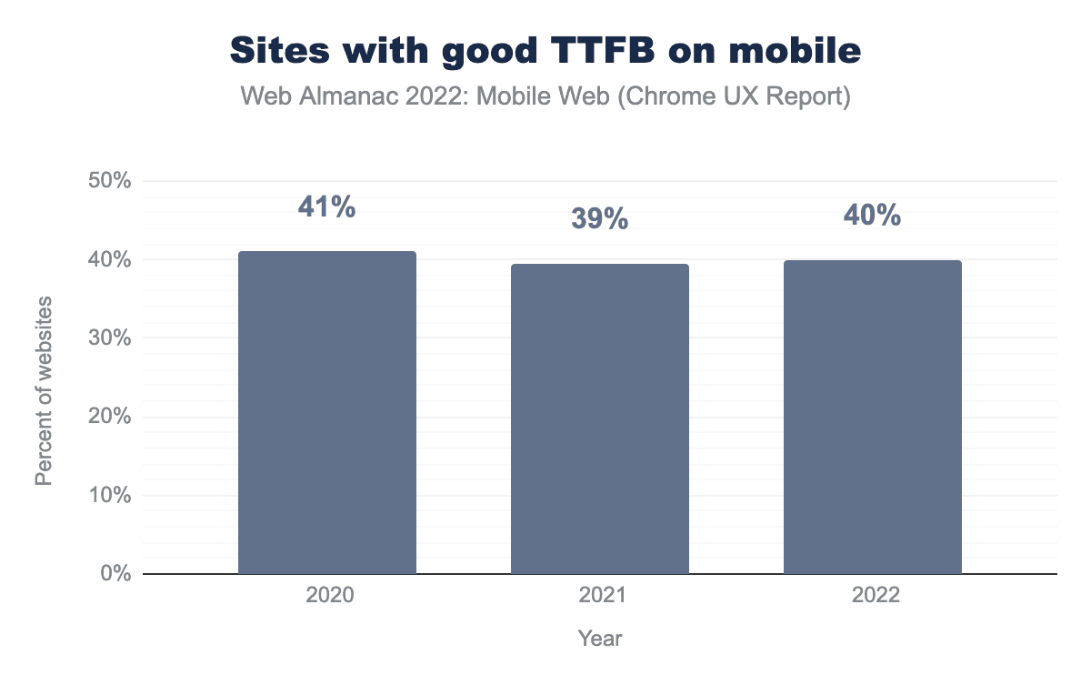 As you can see above, there are only minor fluctuations in the percent of mobile sites that are considered “good” from 2020 to 2022, going from 41% in 2020 down to 39% in 2021, then back up to 40% in 2022.