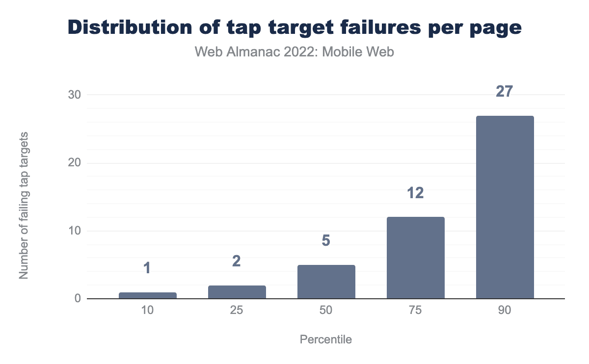 Pages that fail the audit generally have more than one failing link. The median number of failing tap targets is five, but in some cases, when sites fail, the number of failing tap targets can be quite high. We see that the worst 10 percent of sites have at least 27 failing tap targets.