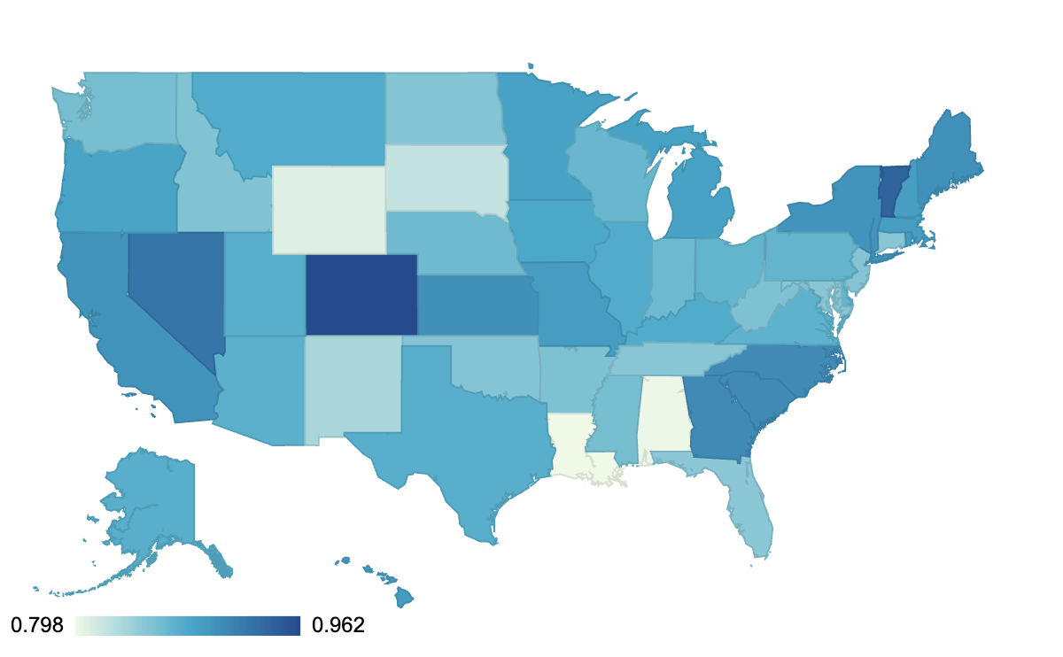 Again, Colorado and Vermont are much further ahead than other states. Colorado has established a centralized Statewide Internet Portal Authority (SIPA), along with new accessibility legislation and now has an average of 96%. The state of Georgia has a central Drupal installation managed through a central agency, does this explain why it is in the top 5? Pennsylvania’s state average is much lower at 82% but they also have a new digital experience team established in 2023.