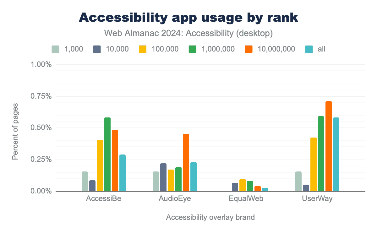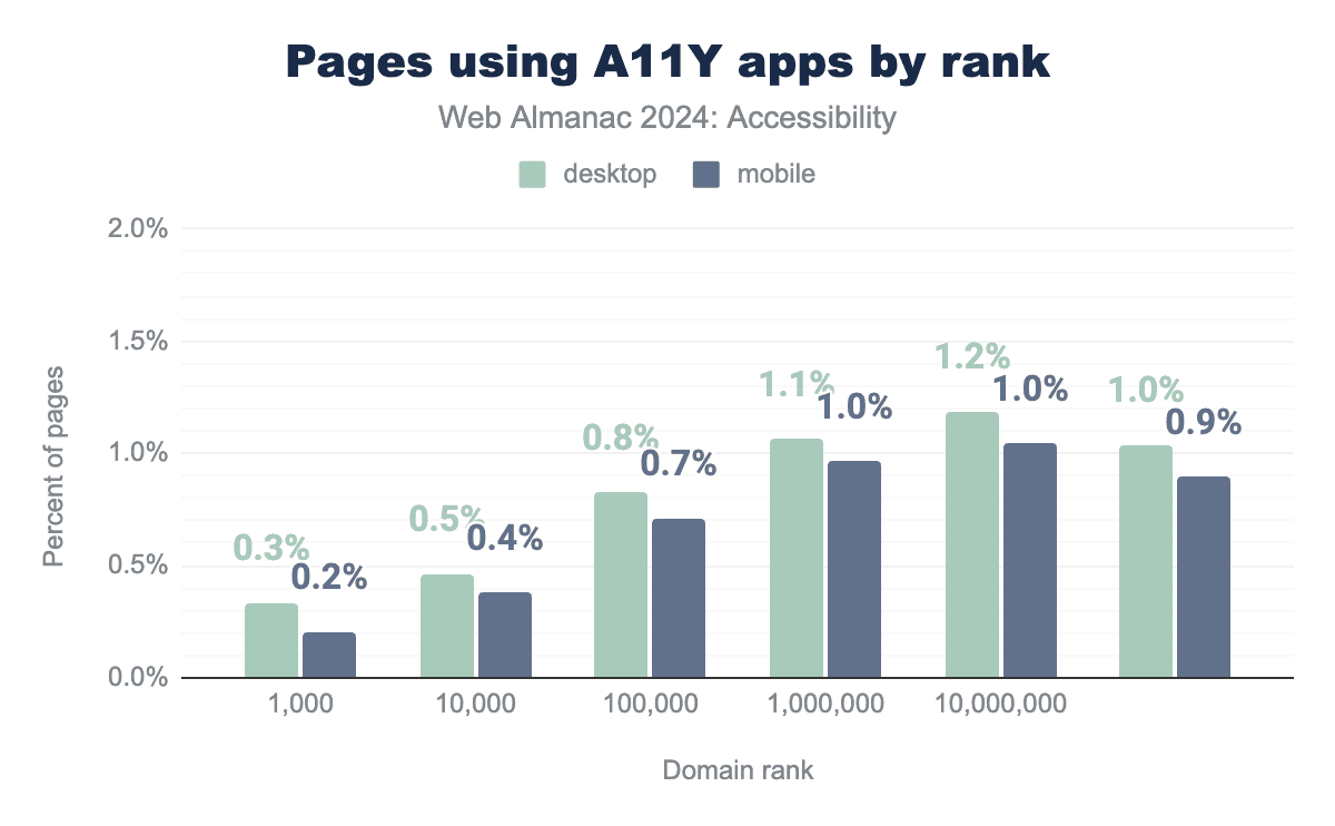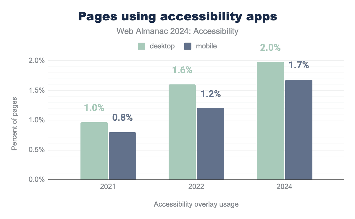 In 2024, we observed that almost 2% of desktop websites utilize known accessibility apps. While not all of these products are accessibility overlays, the detectable overlays show a similar growth trend.