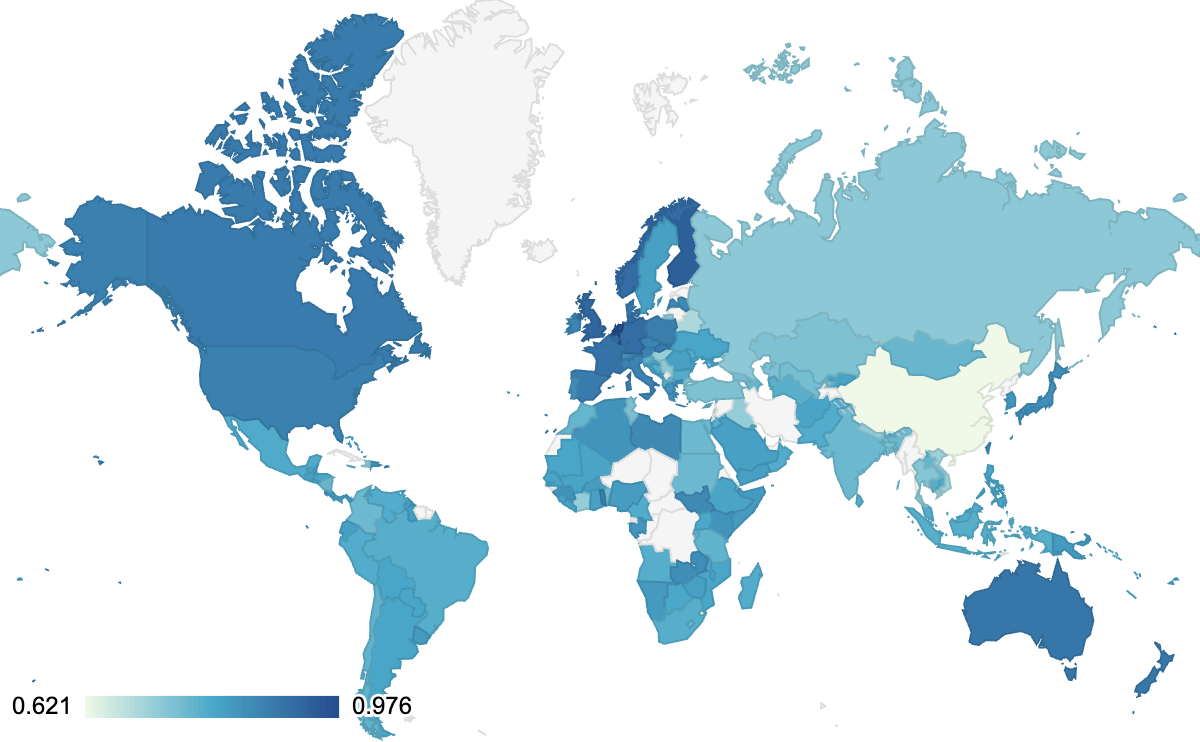 Most modern governments have committed to either WCAG 2.0 AA or WCAG 2.1 AA. It is clear that the implementation of these policies isn’t being equally delivered. This is particularly important when looking into accessibility within the European Union where each member state needs to implement legislation based on the Web Accessibility Directive. It should be possible to compare the 3-year EU member state reports with the values provided here and in future Web Almanacs. It is worth noting that the average for the United States is 87%.