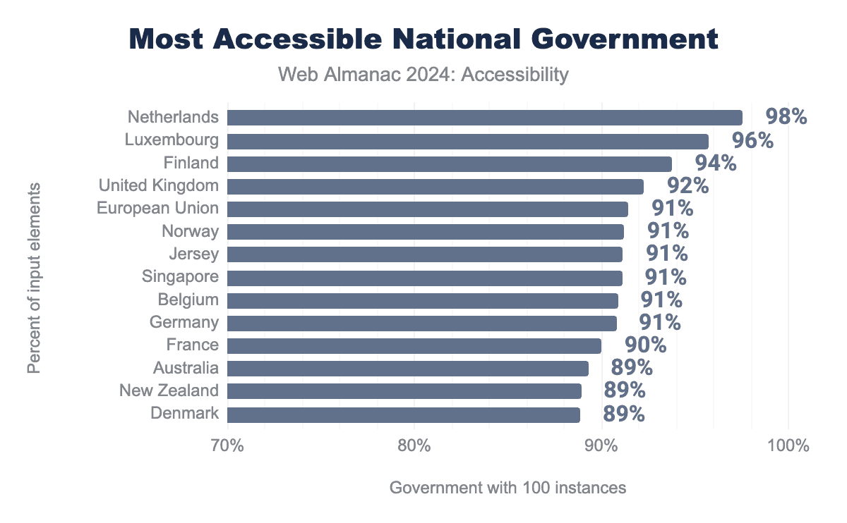 The Netherlands (98%) are firmly in the lead, followed by Luxembourg (96%) and Finland (94%). The United Kingdom and the Netherlands both have a standardized design system which is prioritizes accessibility. What contributes to Luxembourg and Finland’s success? Considering that most accessibility content is available only in English, has this reduced adoption by some governments?