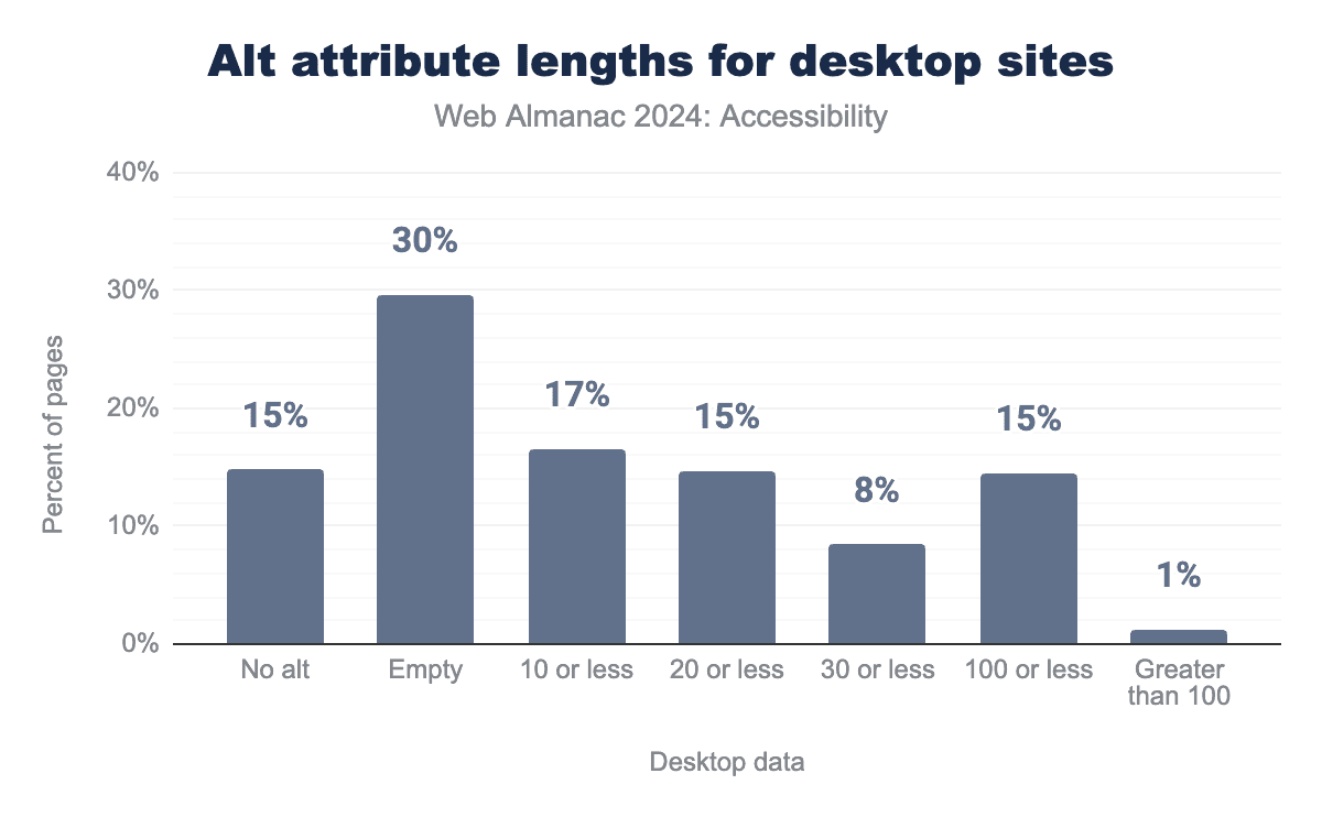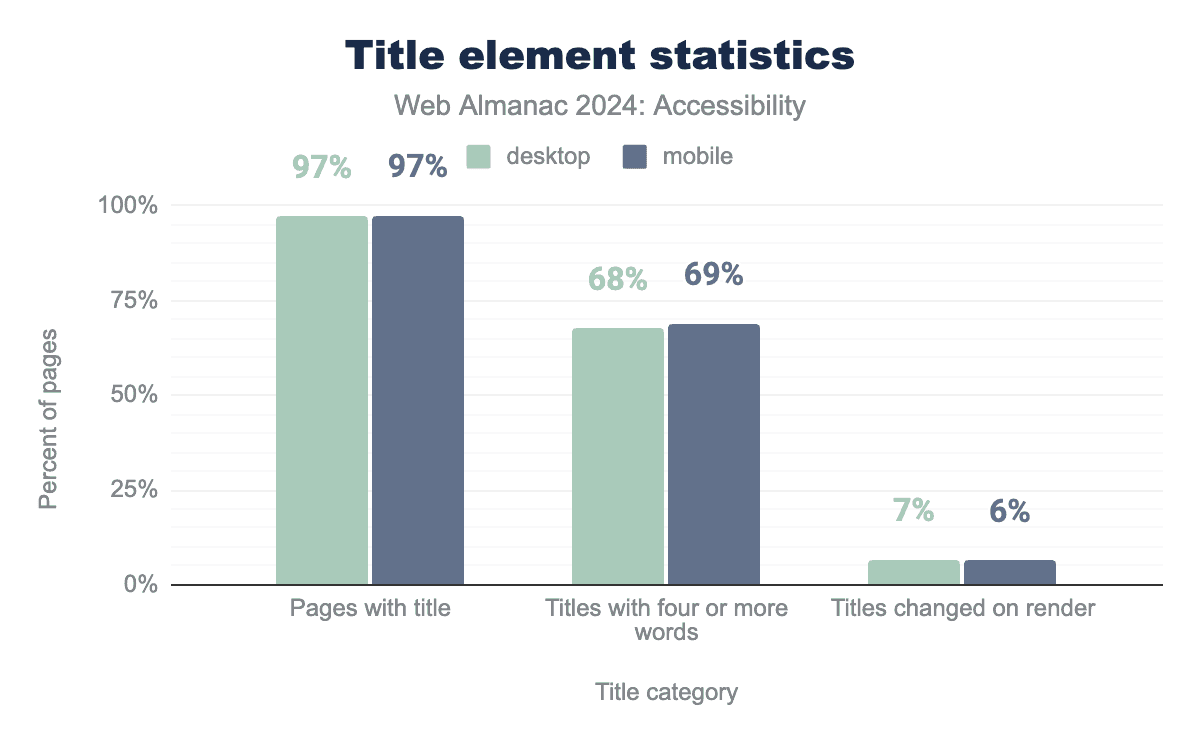 <title> element, 69% of sites of those titles have four or more words, and 7% of desktops and 6% of mobile titles are changed on render.While 97% of mobile websites include a document title, only 69% have titles that are more than four words long. Since our analysis is limited to the home page and a secondary, we have limited insights about the inner pages. We did find that secondary pages were 8% more likely to have descriptive titles of more than four words (78% on average in 2024). Ideally, a title should include both a brief description of the page’s content to enhance navigation and the website’s name.