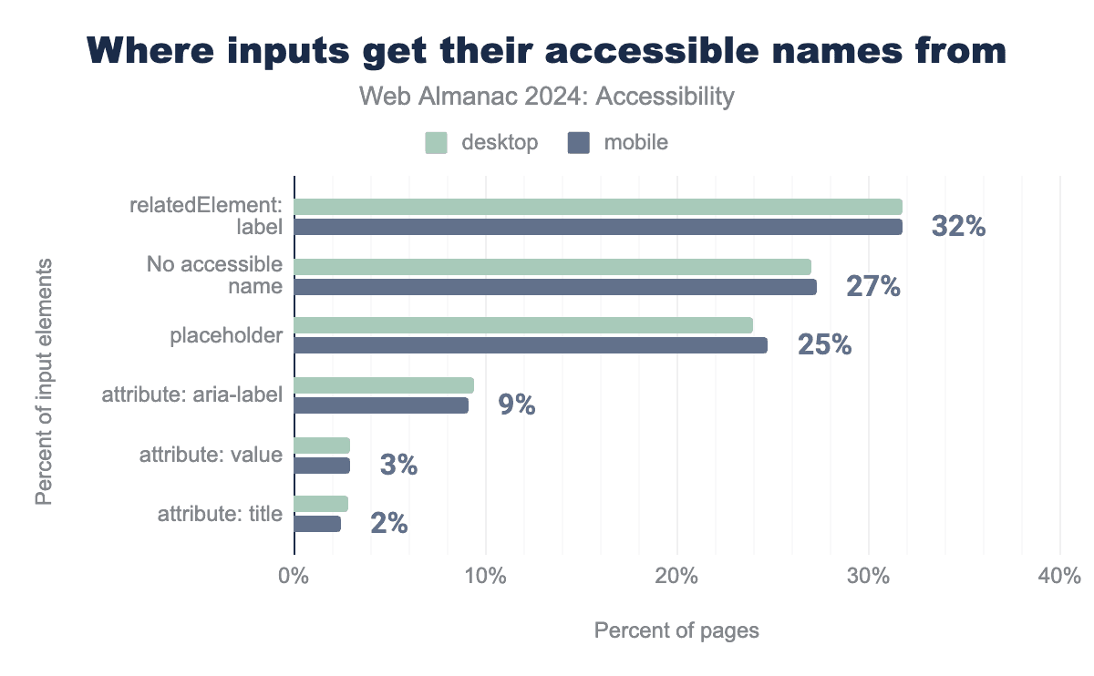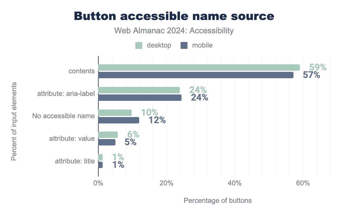 The sr-only and visually-hidden class names are frequently used by developers and UI frameworks to create text that is only accessible to screen readers. For instance, Bootstrap and Tailwind include sr-only classes for this purpose. We found that 16% of desktop pages and 15% of mobile pages used one or both of these CSS classes (each up a percentage point from 2022). It’s important to note that not all screen reader users are visually impaired, so relying too heavily on screen reader-only solutions should be avoided. When this technique is used with an interactive element’s accessible name, it can make it difficult for people who use their voice to control their computer to know what command to give to interact with the element.