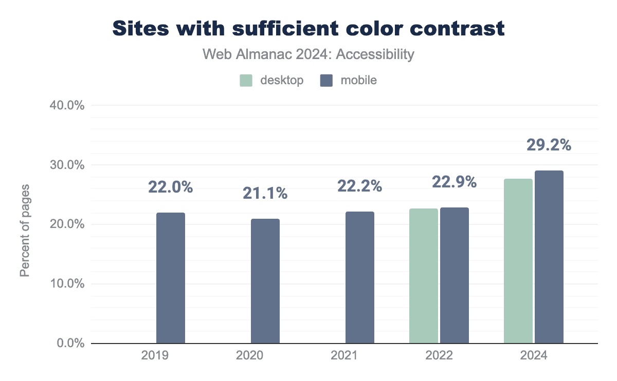 The Lighthouse test determined that 29% of mobile sites and 28% of desktop sites have sufficient text color contrast. This is a moderate improvement over previous years, but it is still far below what is required for basic readability.