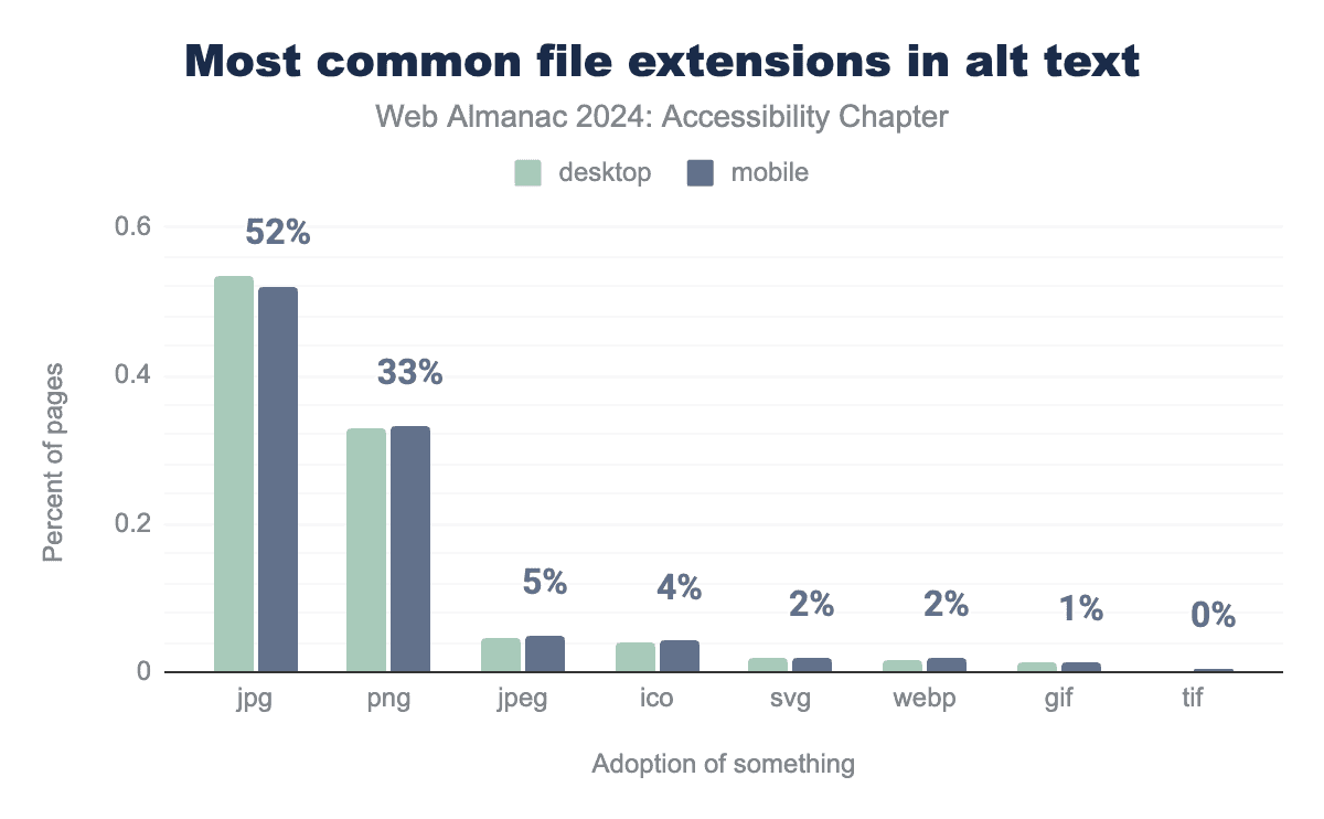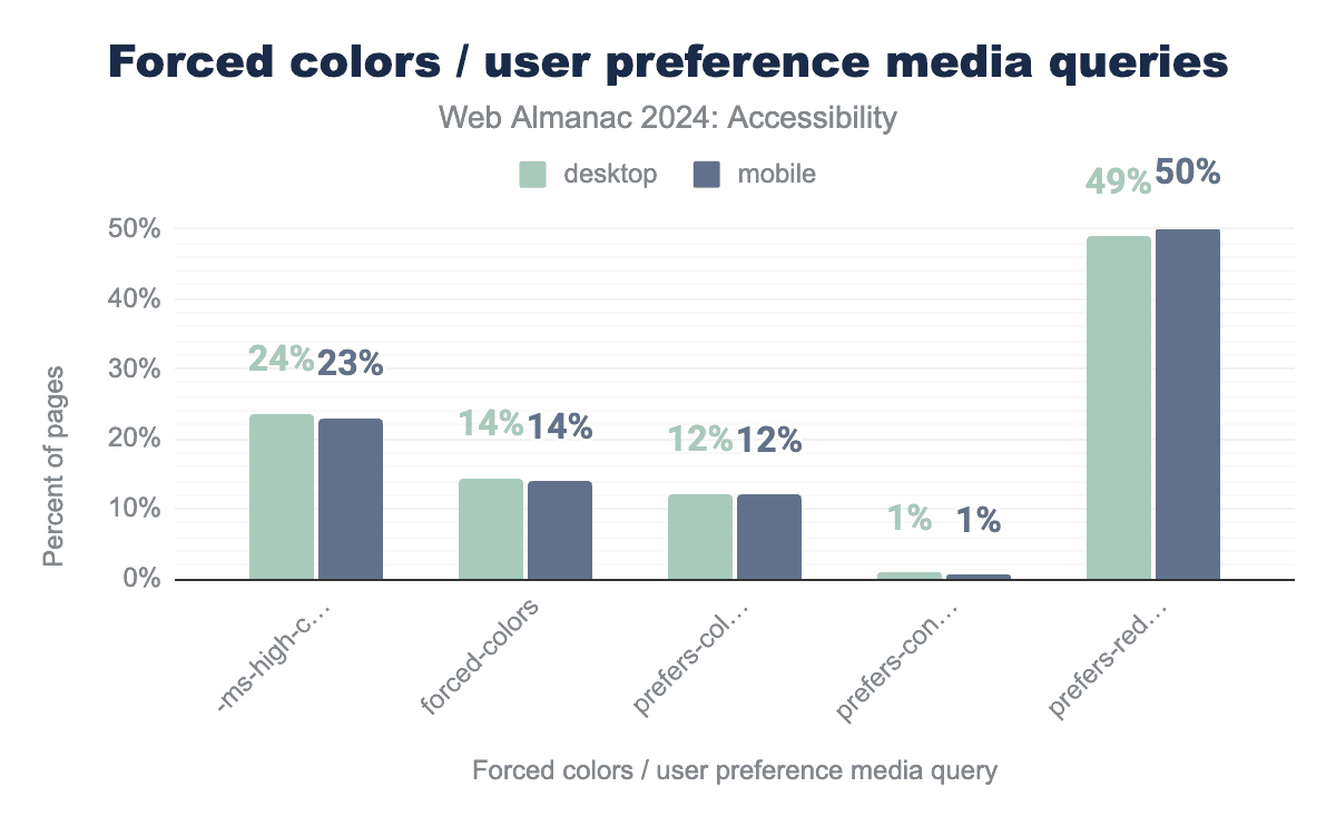 prefers-reduced-motion media query, 12% of sites use prefers-color-scheme, and prefers-contrast is used by just under 1% of desktop and mobile sites.We discovered that over 50% of mobile sites include the prefers-reduced-motion media query, up from 34% in 2022. This is important because digital animations can harm individuals with vestibular disorders; using this query allows for adapting or removing such animations to improve accessibility. Mozilla’s Developer community has some good resources on building motion-sensitive sites.