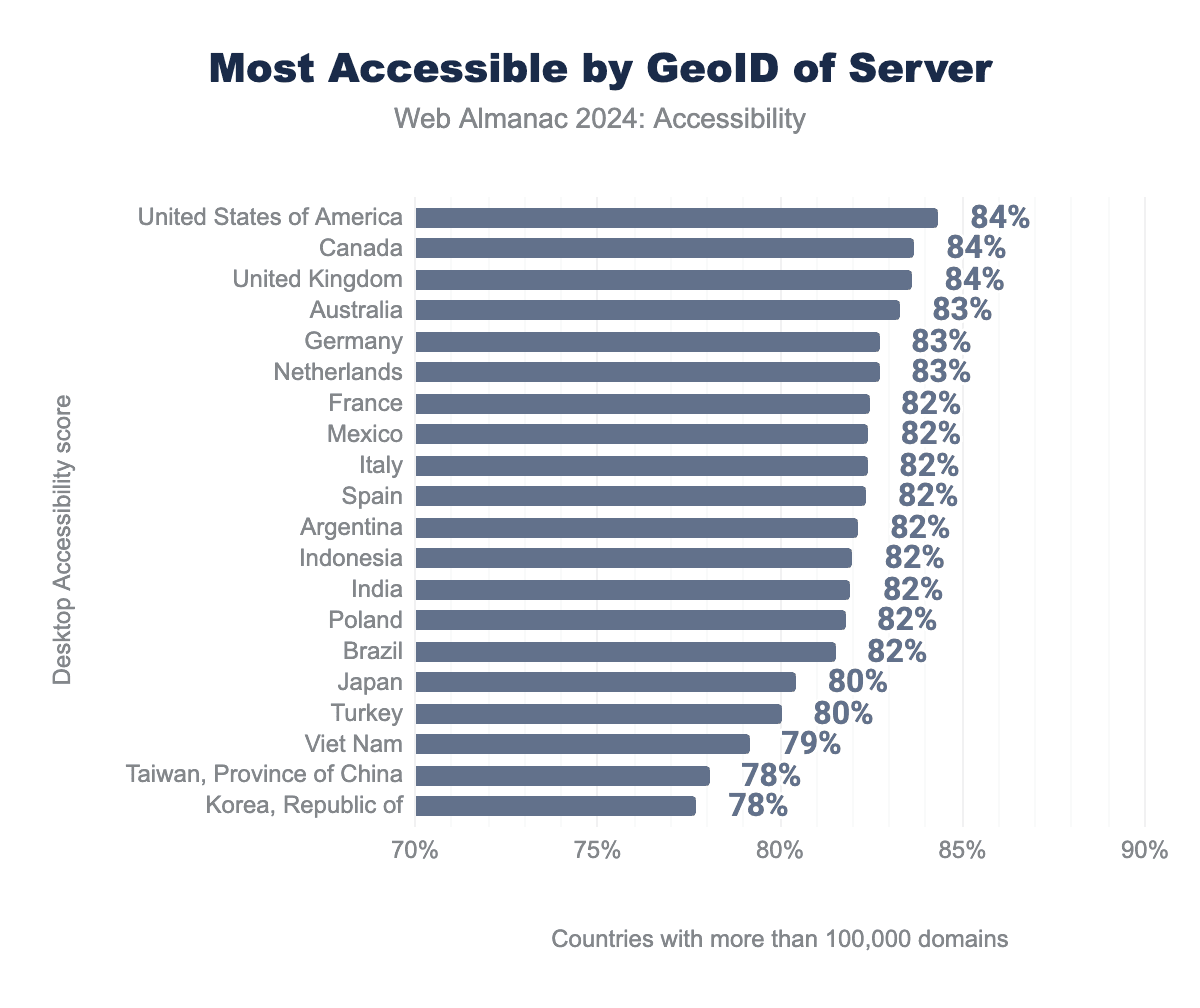 It is worth noting that many sites that operate in the USA are subject to the Section 508 guidelines on accessibility. Organizations are being sued in the USA, under ADA Title III, for not having accessible websites. It is not surprising that the USA is the most accessible country. Other jurisdictions are beginning to penalize companies that sell inside their geography or to their citizens. Increasingly people are looking at the European Accessibility Act and preparing for the new requirements that will be introduced in 2025.
