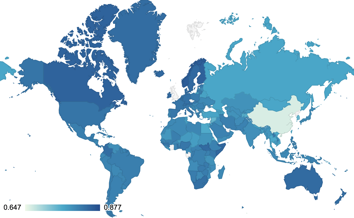 The following map shows the average desktop accessibility score by country top level domain (TLD).