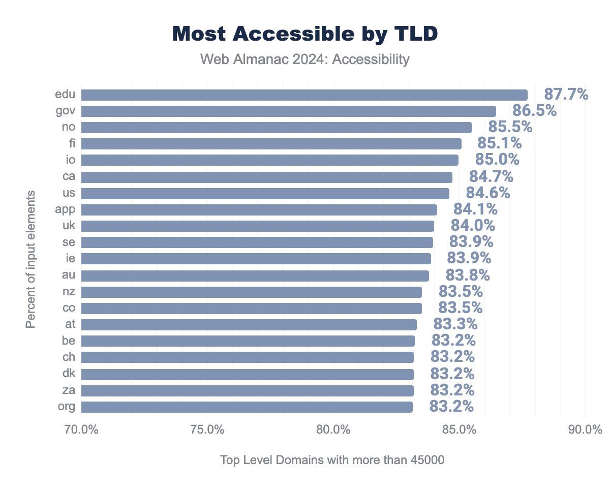 As with the prior chart .edu and .gov domains are the most accessible. The US Government under Section 508 and Section 504, have had this as part of their mandate for more than two decades. Early accessibility legislation and active lawsuits have driven accessibility adoption in the United States. Countries outside the USA started providing legislation and enforcement measures for WCAG conformance later. Lainey Feingold maintains a great list of global law and policy.