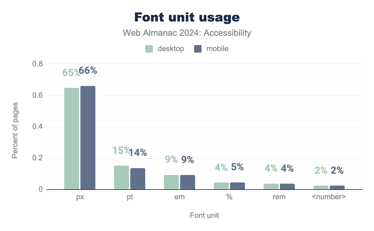 <number> on 2% of both, and finally pt on 15% on desktop and 14% on mobile.How font sizes are defined also affects the readability, as pixels are not as flexible as other units. Pixel (px) use is 65% in desktop and 66% in mobile. The use of em has increased to 9% from 6% in 2022. rem was at 6% in 2022, and has reduced to 4% now. There is not a significant increase in the use of em or rem since 2022, even though it often gives the user a better experience when they increase or decrease their font size in their browser settings.