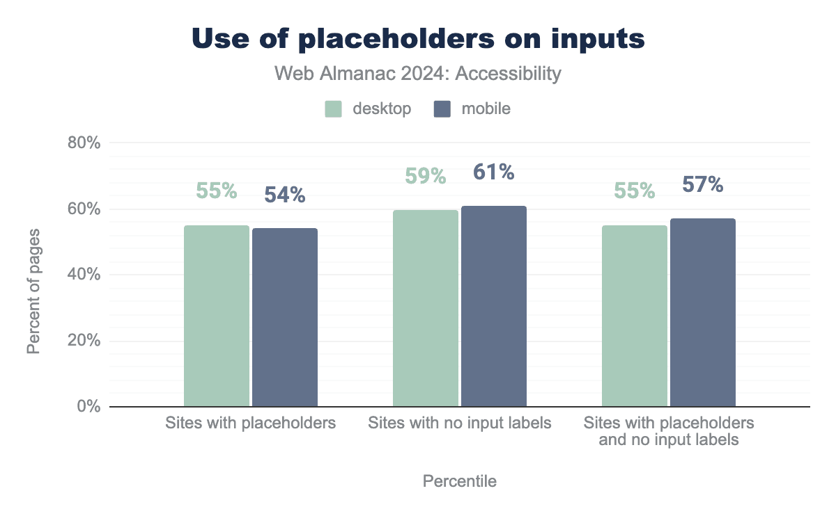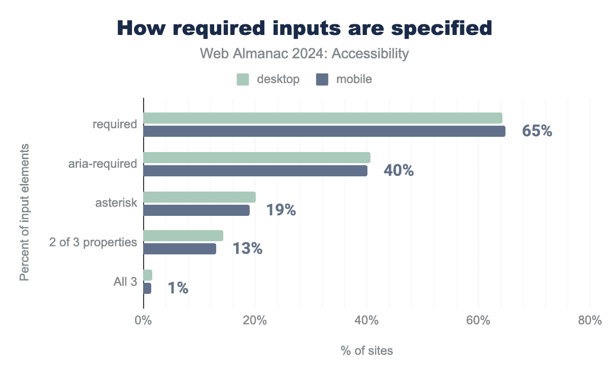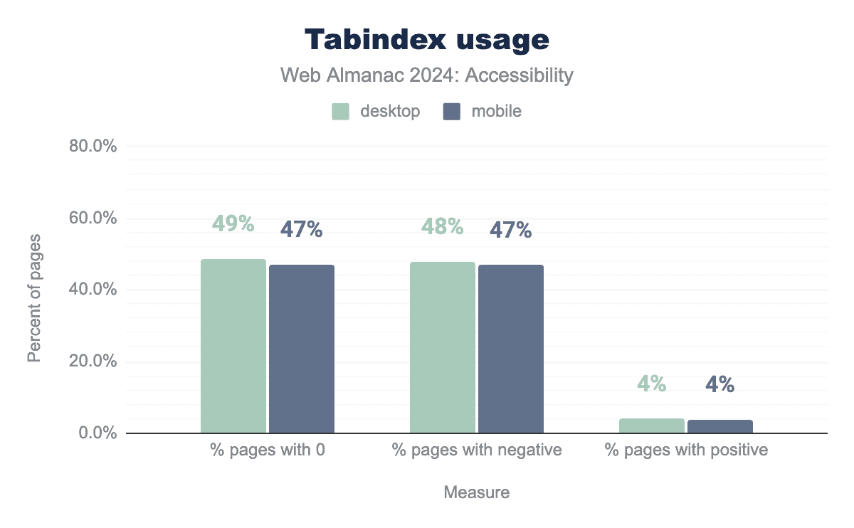 Our analysis shows that 63% of mobile websites and 64% of desktop websites utilize tabindex (up from 60% and 62% respectively). This attribute serves several purposes, which can affect accessibility:
