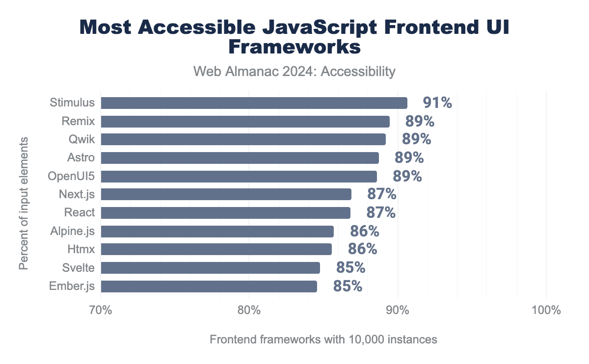 Stimulus, Remix and Qwik are several percent more accessible on average than React, Svelte or Ember.js.