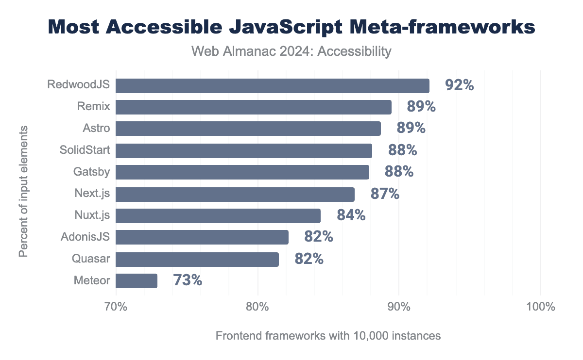 RedwoodJS is clearly the most accessible, followed by Remix and Astro.