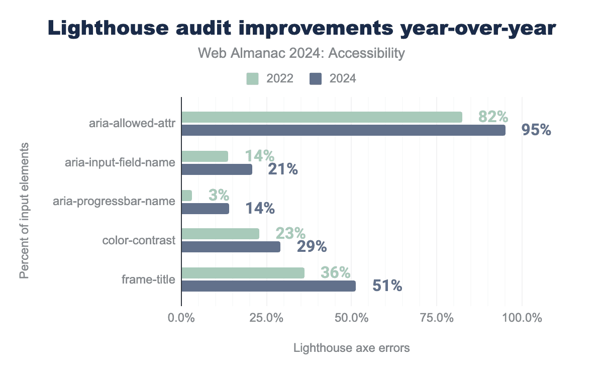 aria-allowed-attr passes on 82% of sites in 2022, and 95% in 2024. aria-input-field-name passes on 14% of sites in 2022, and 21% in 2024. aria-progressbar-name passes on 3% of sites in 2022, and 14% in 2024. color-contrast passes on 23% of sites in 2022, and 29% in 2024. frame-title passes on 36% of sites in 2022, and 51% in 2024.Google Lighthouse now contains 57 different audit tests which they use for their scoring. These are all based on Deque’s open source axe-core, which is widely adopted in a range of accessibility products and services. With the exception of 7 audits (aria-meter-name, aria-toggle-field-name, aria-tooltip-name, document-title, duplicate-id-active, html-lang-valid, and object-alt) there have been improvements across the board. Both object-alt and aria-tooltip-name were called out for their improvements in 2022, but sadly this improvement was not repeated in 2024.