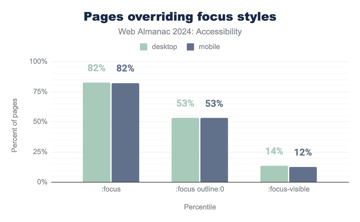 We discovered that 53% of websites apply :focus {outline: 0} (in 2022 it was 86%), which removes the default outline provided by browsers for focused interactive elements. Although some websites implement custom styles to override this, it’s not always the case, making it challenging for users to identify the currently focused element and impeding navigation. Sara Soueidan offers valuable guidance on designing WCAG-compliant focus indicators. On a positive note, 12% of websites now use :focus-visible (up from 9% in 2022 and 0.6% in 2021), which is a pseudo class that uses browser heuristics to determine when to show the focus indicator. This is a significant improvement in accessibility practices.