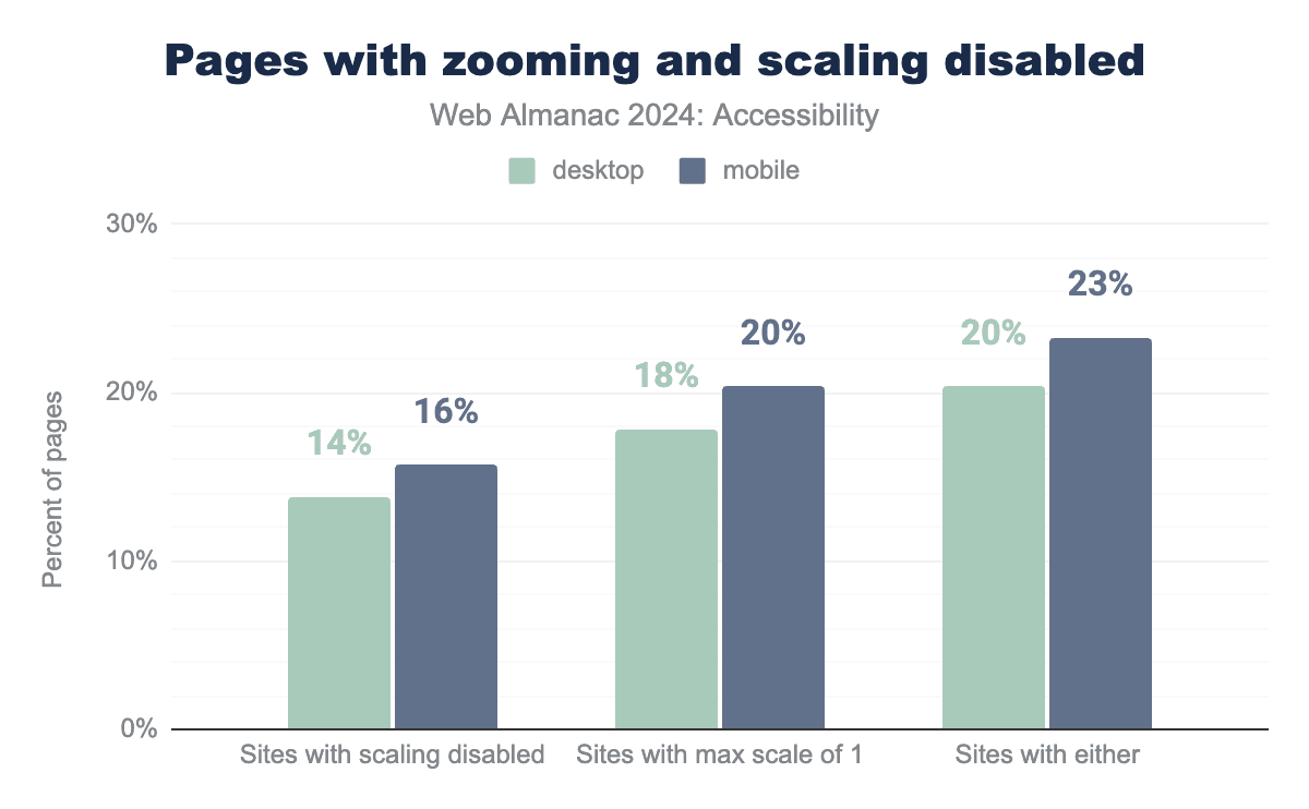 We are happy to say that we are seeing a reduction in sites which are disabling zooming and scaling. Compared with 2022’s data for mobile users there are 2% less sites who have disabled scaling and 4% that have disabled a max scale of 1. The desktop average both went down by 2% compared to the last report. Users can configure their browsers to override this setting, but some defaults still respect the author’s preferences.