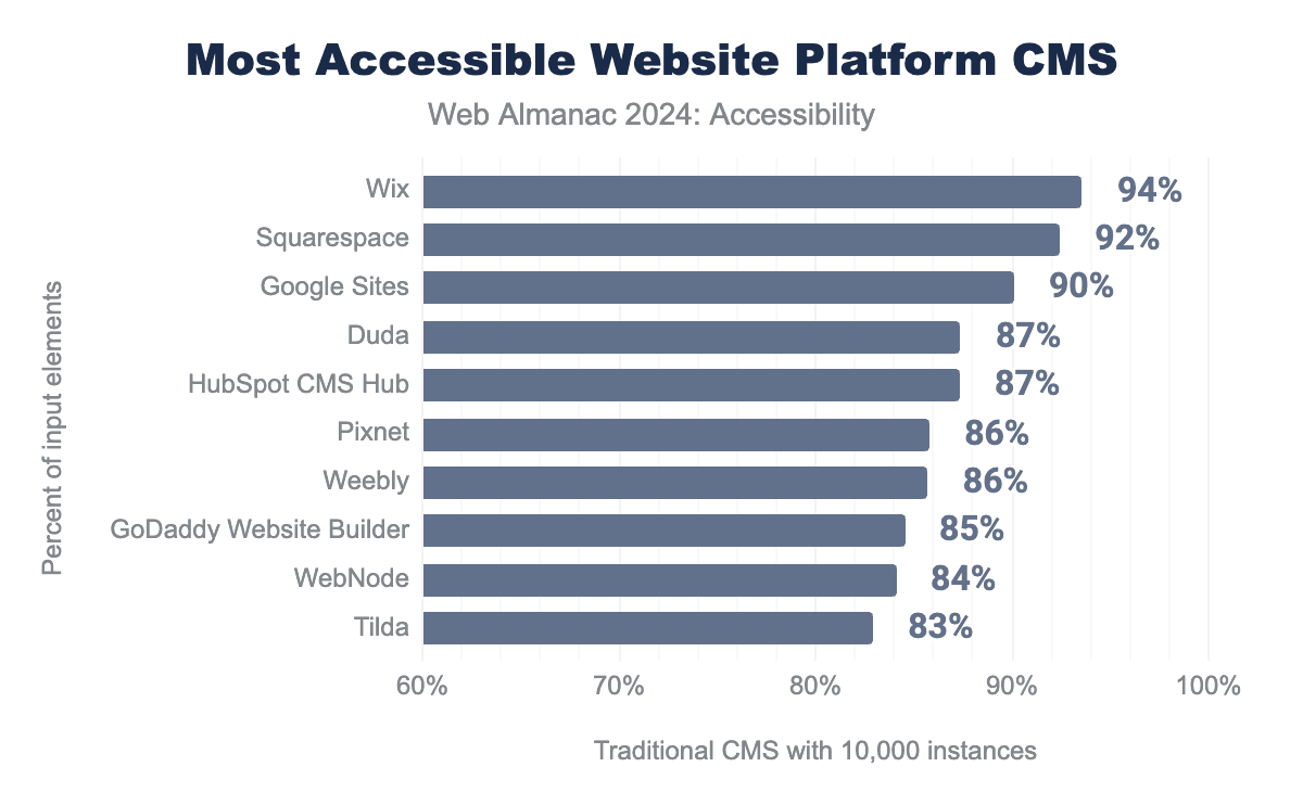 On the positive side, Duda stands out for button names, where only 3% of its websites fail the test, compared to a median of 13%. Even more impressive is Wix only 20% of Wix websites fail the Lighthouse test for color contrast, while the median failure rate among the most-used CMS platforms is 70%. Similarly, Wix performs exceptionally well regarding alternative text for images, with only 1% failing, compared to a median of 34%.