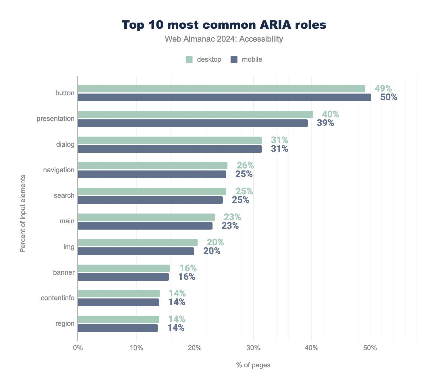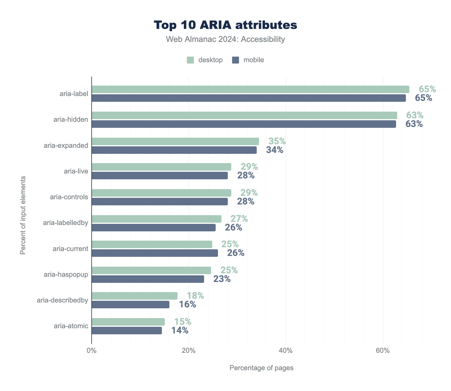 ARIA live regions enable screen readers to announce changes in the DOM. We found that 29% of desktop pages use live regions with the aria-live attribute (up from 23% in 2022) and 28% of mobile pages use aria-live (up from 22% in 2022). Additionally, pages use ARIA live region roles with implicit aria-live values: