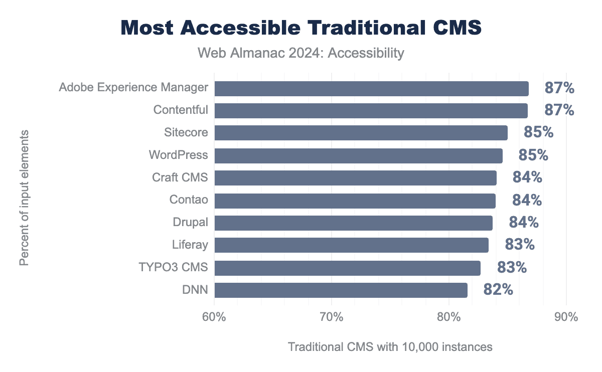 When most folks think about CMS, they think about the ones that you can download and install yourself. This is predominantly made up of open source tools, but not exclusively. Adobe Experience Manager (AEM), Contentful and Sitecore were the most accessible three in this list of top 10. A possible explanation for this is that closed-source software like AEM is more likely to be used by larger corporations, which have more resources to address accessibility issues. Additionally, open-source software gives website owners a lot of freedom, which in some cases can lead to worse accessibility.
