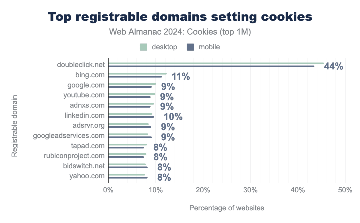 Among the ten most common domains that set cookies on the web, we only find domains involved in search, targeting, and advertising services. This result outlines the coverage that some third-parties have of the web, for example: Google’s owned advertising platform DoubleClick sets cookies on more than 44% of the top one million websites while others are at about 8% to 12%.