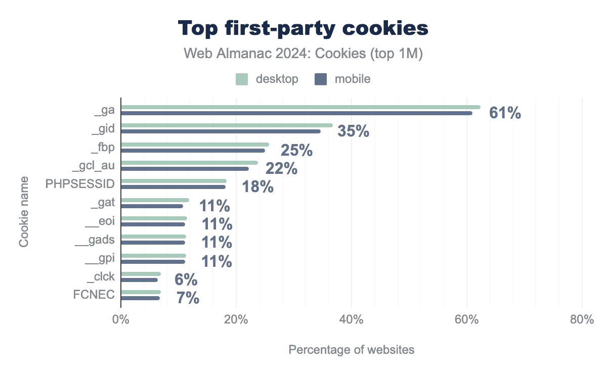 _ga and _gid cookies, which are used for website statistics and analytics reports, on more than 61% of websites for both mobile and desktop clients.The first two first-party cookies _ga and _gid are set by Google Analytics to store client identifiers and statistics for site analytics reports, a majority of websites use Google Analytics (more than 60% and 35%, respectively). The third one _fbp is set by Facebook and used for targeted advertising on 25% of the websites.