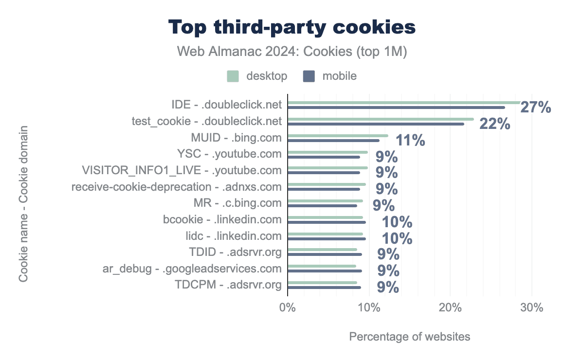On the top one million most visited websites, about 39% of the cookies are first-party and 61% are third-party cookies. Thus, a majority of the cookies set on the web are third-party cookies. We also observe that this distribution is very similar whether these websites are accessed through a desktop or a mobile client. This indicates that overall there is little to no behavior change based on the type of client used. However, some websites may still behave differently and/or use other tracking methods such as fingerprinting depending on the type of client (see the Privacy chapter for more).