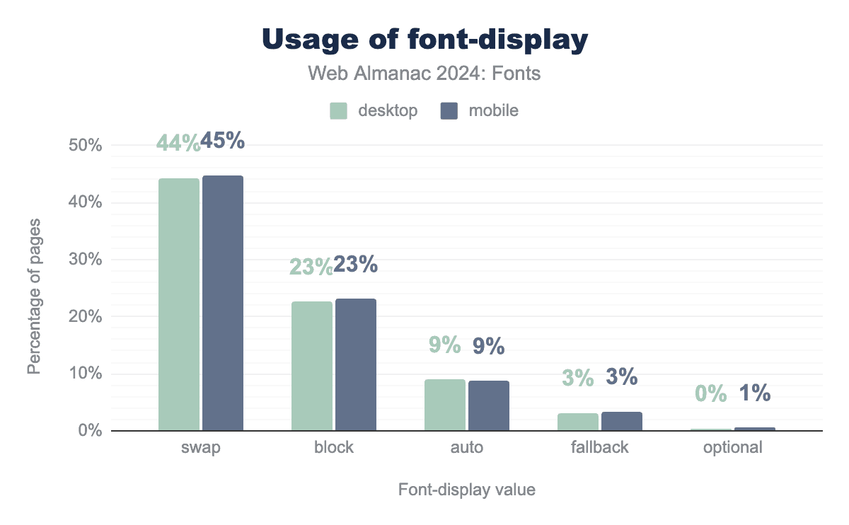 Compared to the 2022 data, there is a visible increase in the use of all font-display strategies, the biggest one being on swap, whose usage on both mobile and desktop pages jumped from around 30% in 2022 to over 44%.