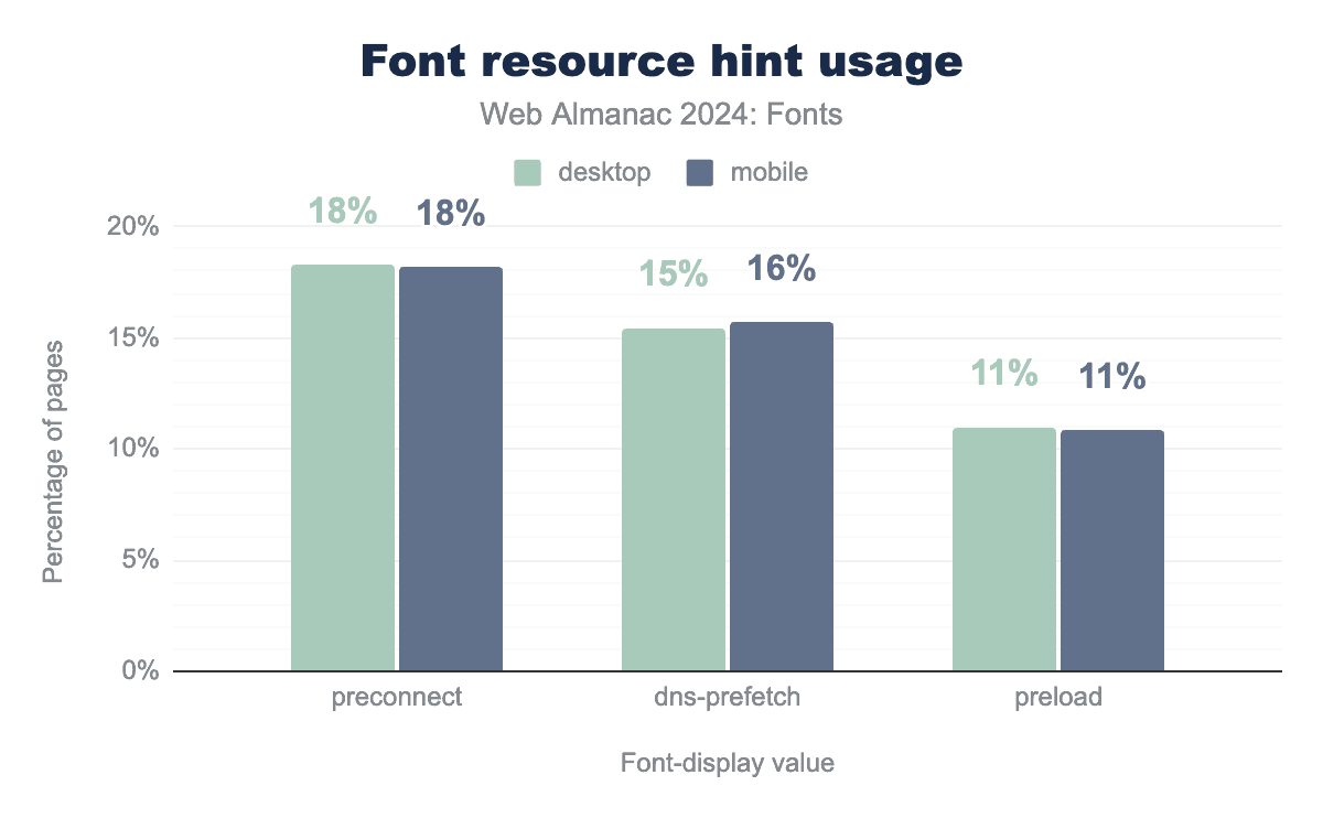 Around 11% of all tested mobile and desktop pages are preloading their web fonts, indicating to the browser that they should download these files, hopefully early enough to avoid shifts due to late font arrival. Note that using preload incorrectly can harm performance instead of helping it. To avoid this, we need to make sure that the preloaded font will be used and that we don’t preload too many assets. Preloading too many assets can end up delaying other, more important resources.