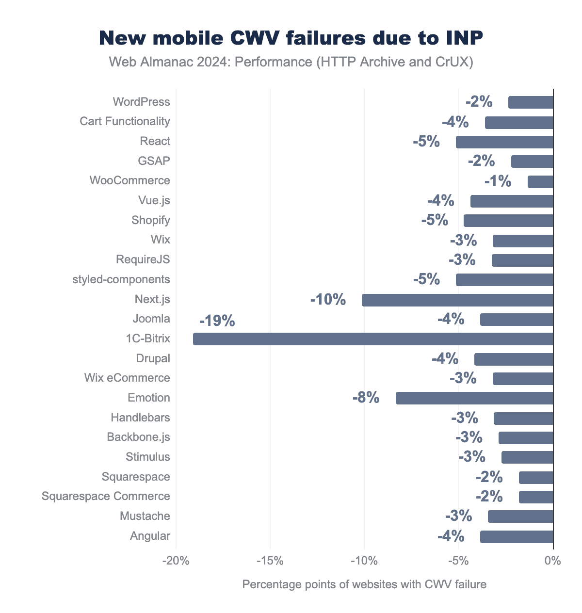Several technologies were significantly impacted, including a 19% drop for 1C-Bitrix (a popular CMS in Central Asia), a 10% drop for Next.js (a React-based framework), and an 8% drop for Emotion (a CSS-in-JS tool). We can’t be entirely certain that the decline in CWV scores is solely due to the technology used. Next.js has server-side rendering (SSR) and static site generation (SSG) features, which should theoretically enhance INP, but it has still seen a significant decline. As Next.js is based on React, many websites rely on client-side rendering, which can negatively impact INP. This could serve as a reminder for developers to leverage the SSR and SSG capabilities of the framework they use.