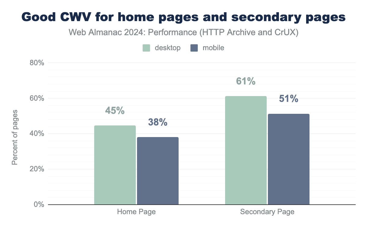 Secondary pages demonstrate significantly better CWV results than home pages. The percentage of the desktop secondary pages with good CWV is by 14 percentage points better than for home pages. For mobile websites, the difference is 13 percentage points. By looking at CWV data only, it is hard to identify what kind of performance experience is better. We will explore these aspects—layout shift, loading, and interactivity—in the corresponding sections.