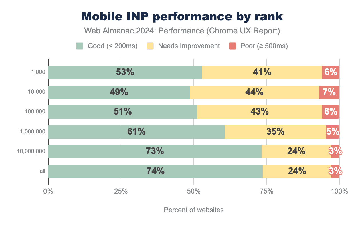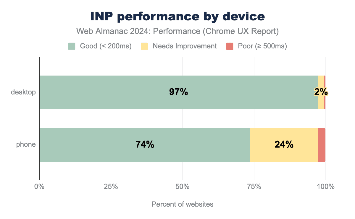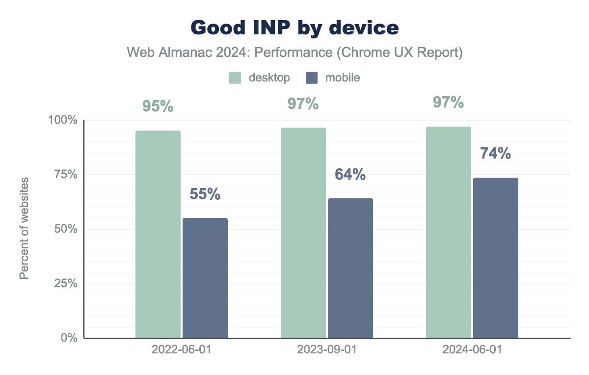 • Despite the improvement in INP each year, a significant gap between desktop (97% good INP) and mobile (74% good INP) performance still exists.