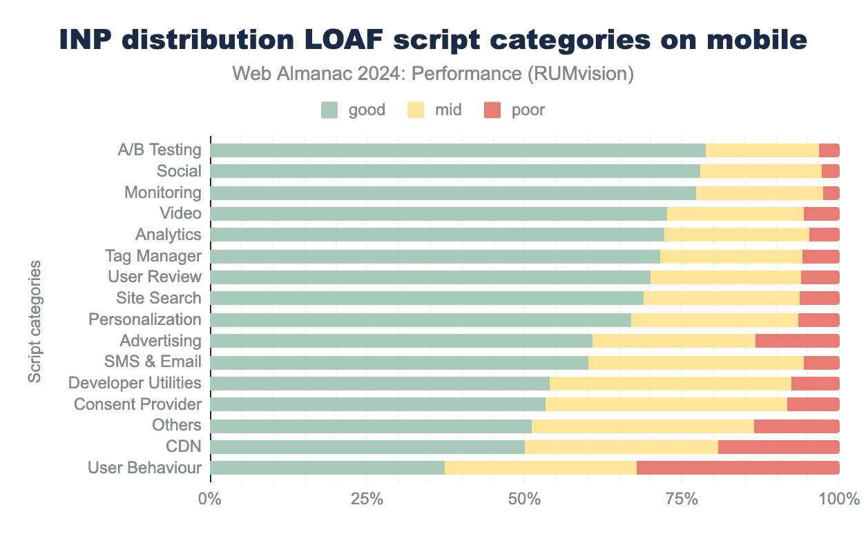 It is worth noting that the monitoring category, which also includes performance monitoring tools, has one of the least impacts on poor INP results. This is a good argument in favor of using web performance monitoring tools, as they help with valuable web performance insights without significantly affecting interactivity performance.