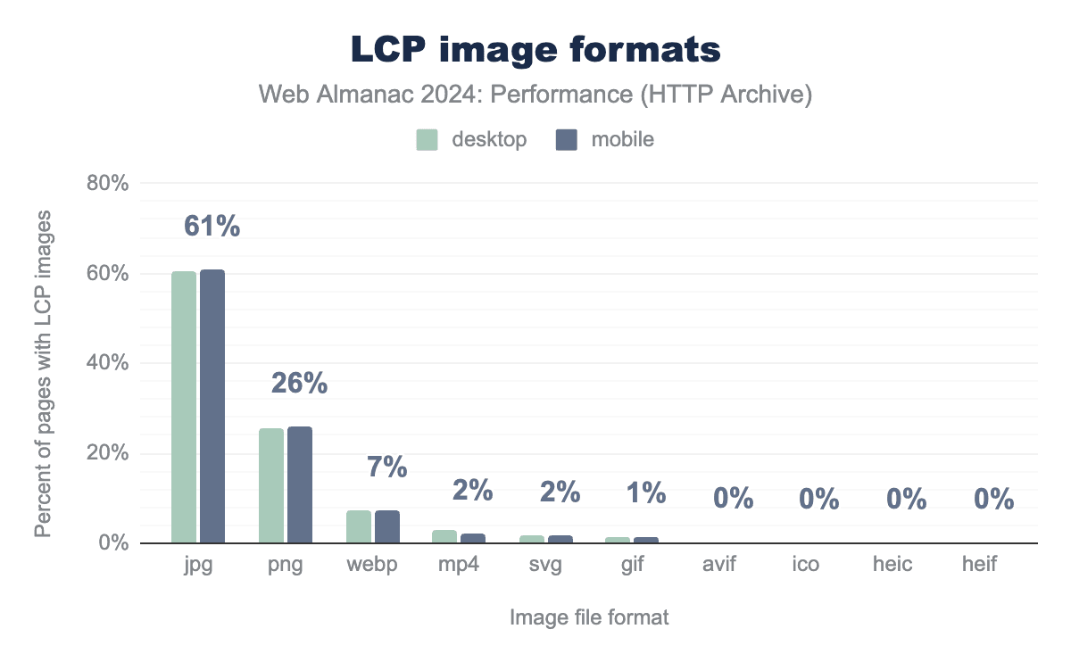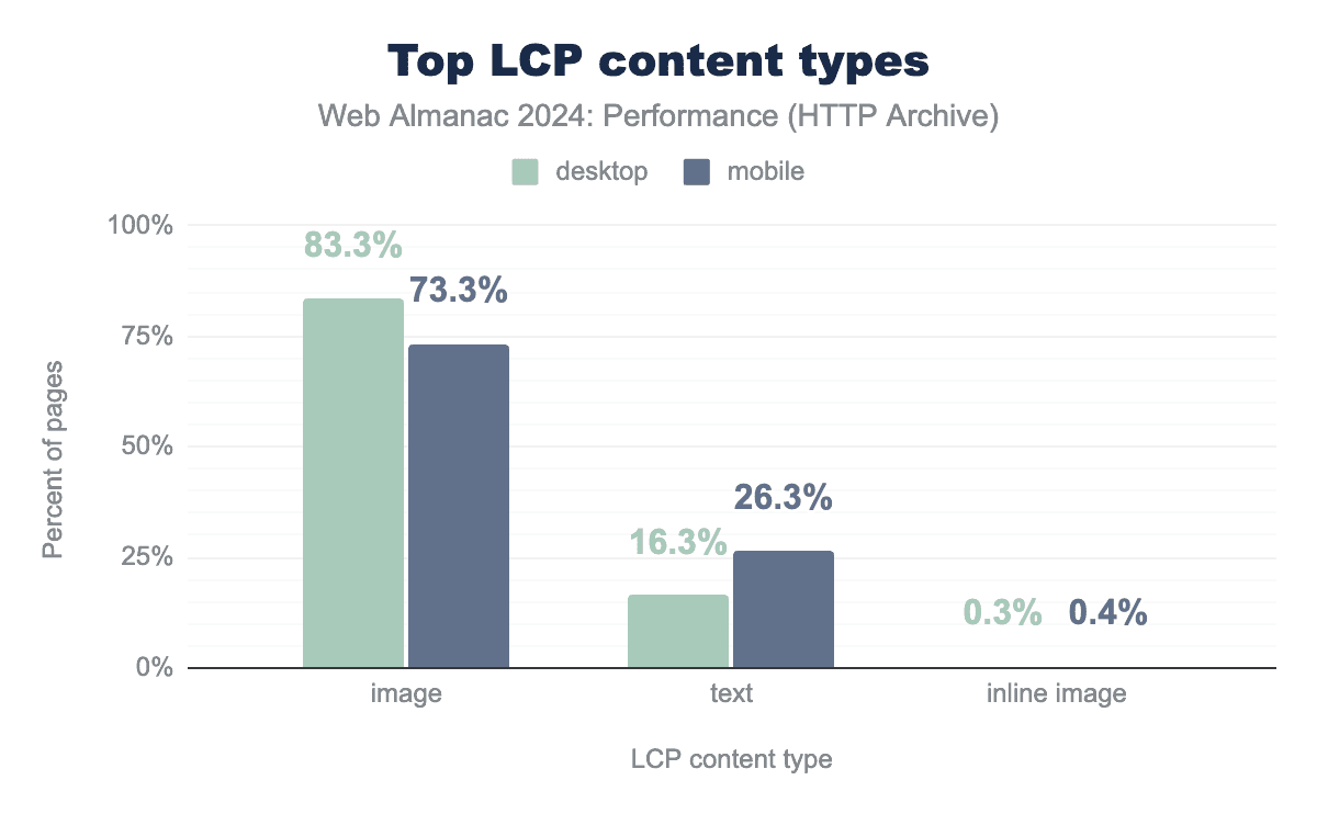 Most LCP elements, or 73% of mobile pages, are images. Interestingly, this percentage is 10% higher on desktop pages. The situation is reversed for text content. Compared to desktop, 10% more mobile webpages use text as their LCP element. This difference is likely because desktop websites can accommodate more visual content due to larger viewport sizes and generally higher performance.
