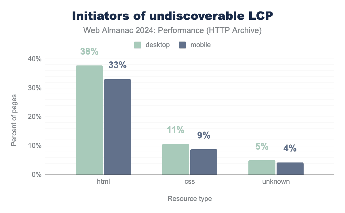Unfortunately, 35% of mobile websites do not have an LCP element that is statically discoverable in the document. While this is a slight improvement over the 39% we saw in 2022, it’s still a significant blocker of LCP performance.