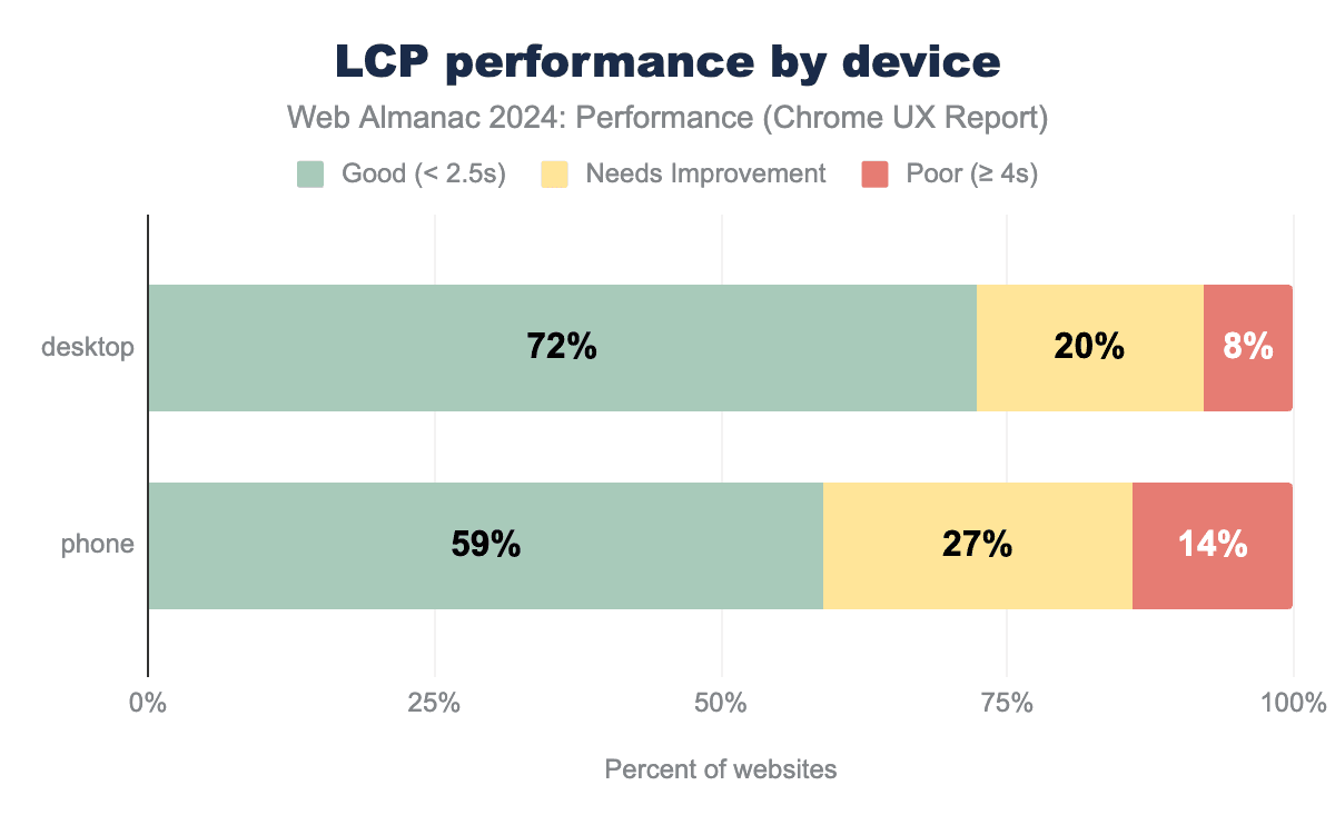 Figure 9.8. The percent of websites having good LCP, segmented by device and page type.