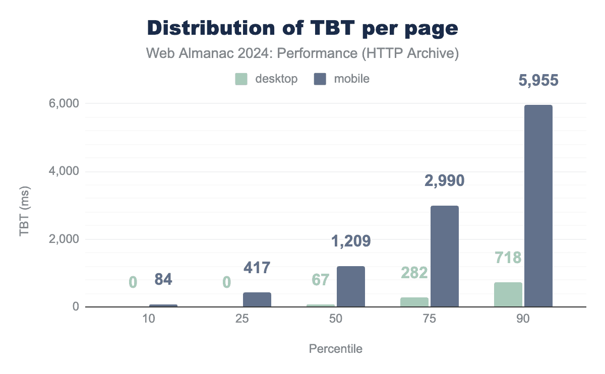 The median TBT on mobile is 1,209 milliseconds, which is 6 times higher than the best practice. In contrast, desktop websites show much better performance, with a median TBT of just 67 milliseconds. It is important to emphasize that the lab results use an emulated low-power device and a slow network, which may not reflect the real user data, as actual device and network conditions can vary. However, even with that in mind, these results still show that in the 90th percentile, user on mobile device will need to wait almost 6 seconds before the site becomes interactive.