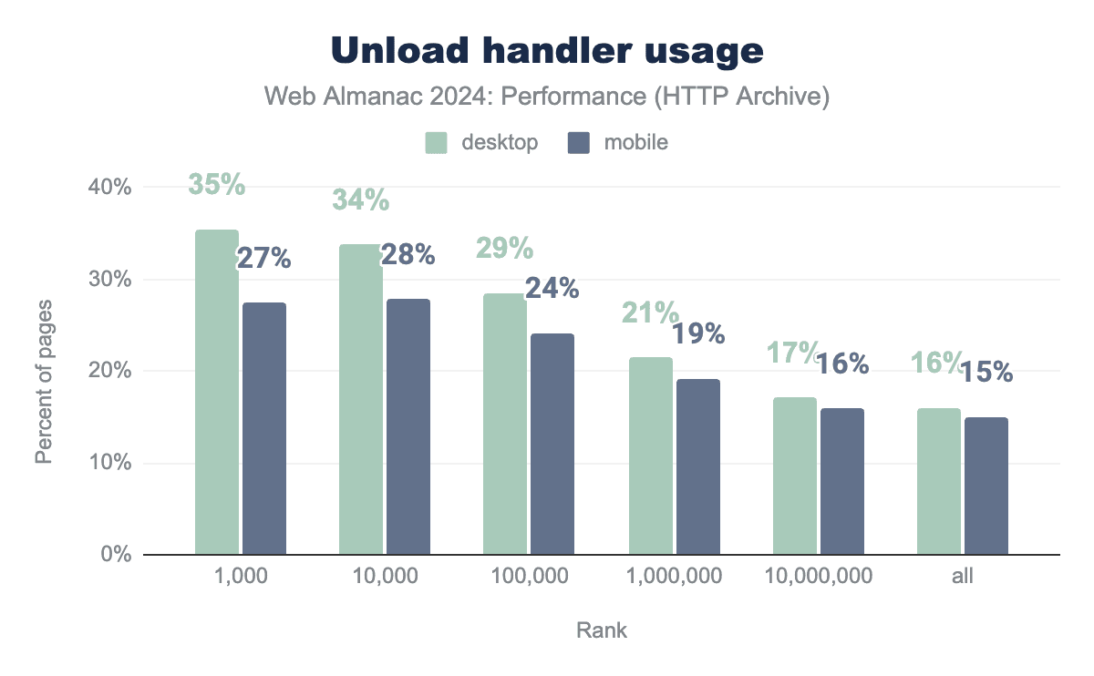 From the above chart showing unload events from pages, we can see a few interesting things. Overall event usage is quite low, 15-16%. However, it increases drastically for the top 1.000 sites, to 35% on desktop and 27% on mobile, indicating that more popular sites probably use quite some more third-party services that often use this specific event. The gap between mobile and desktop is significant as, while mobile sites using unload events are still eligible for the bfcache, they are still unreliable.
