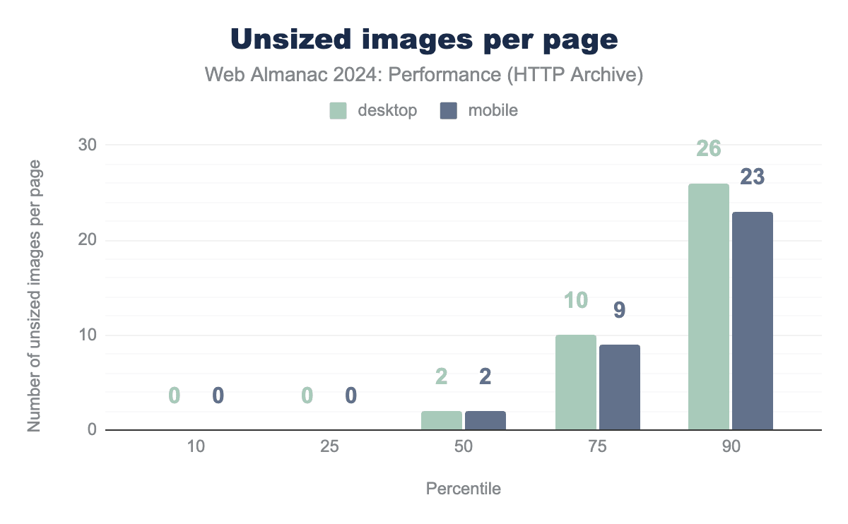 The median number of unsized images per web page is two. When we shift to the 90th percentile, that number jumps to 26 for desktop sites and 23 for mobile. Having unsized images on the page can be a risk for layout shift; however, an important aspect to look at is if images are affecting the viewport and if yes, how much.