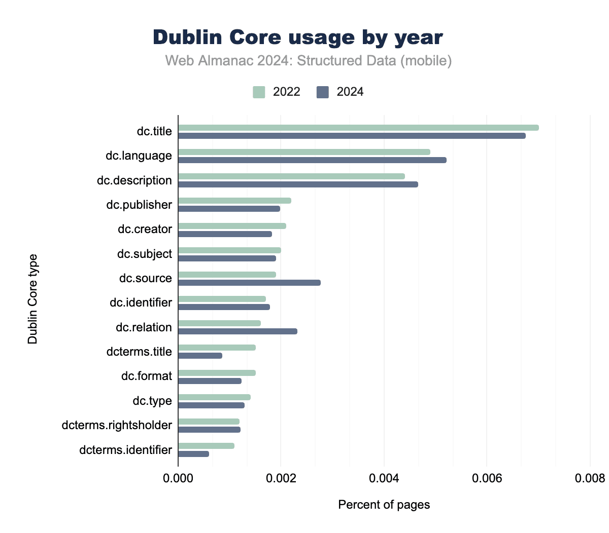 Figure 3.26. A year-on-year comparison of Microformats usage on mobile pages in 2022 and 2024.